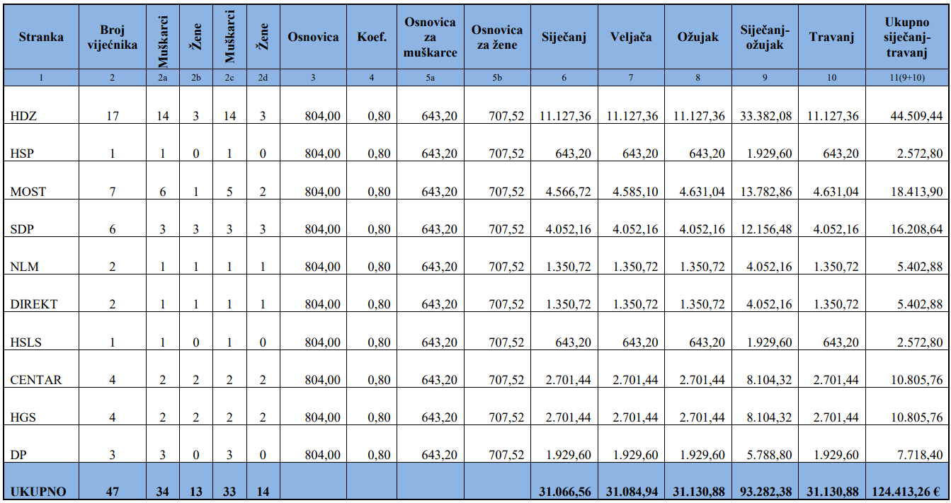 HSP, NLM, DIREKT, HSLS, CENTAR i HGS – Svaka od ovih stranaka dobiva iznose prema broju izabranih vijećnika, s dodatnim naknadama za vijećnice.