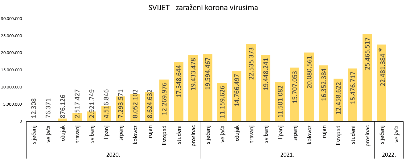 Omikron soj virusa korone sa svojim ishodištem u Južnoj Africi (JAR) neumoljivo se širi diljem Svijeta brzinom i snagom kojom obara sve rekorde. Prosinac je bio rekordni mjesec s 25,5 milijuna zaraženih dok siječanj 2022. nakon prvih deset dana najavljuje više nego dvostruko veće vrijednosti od prethodnog mjeseca prosinca.