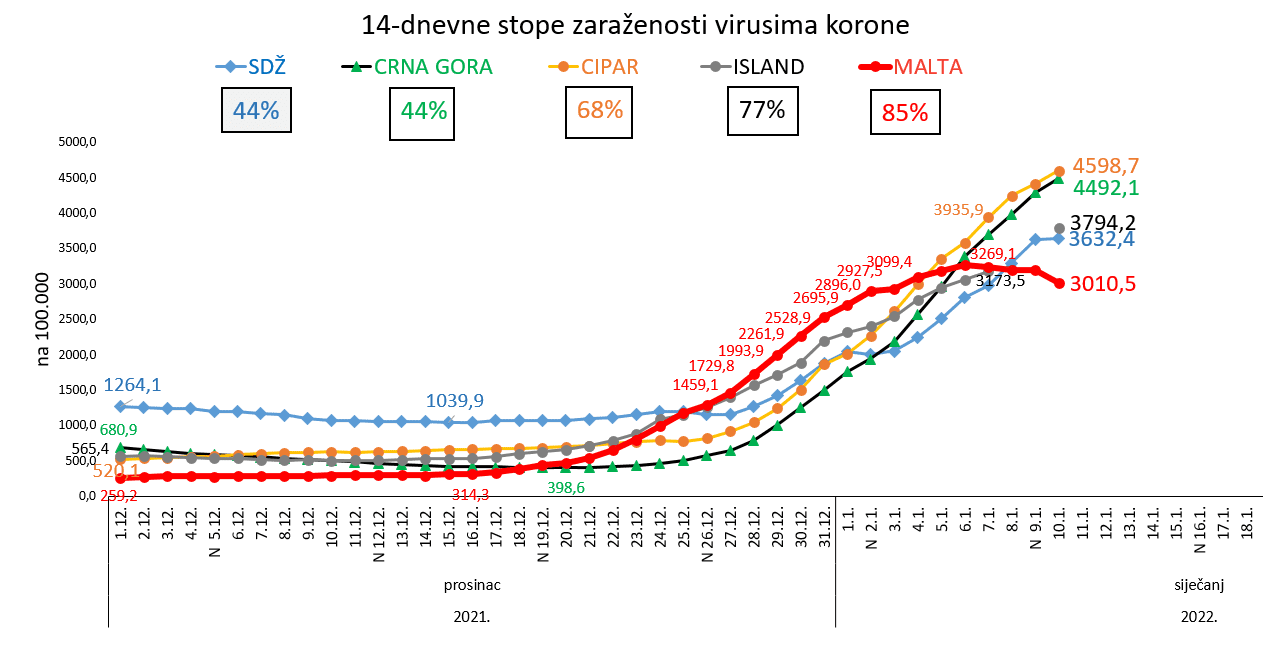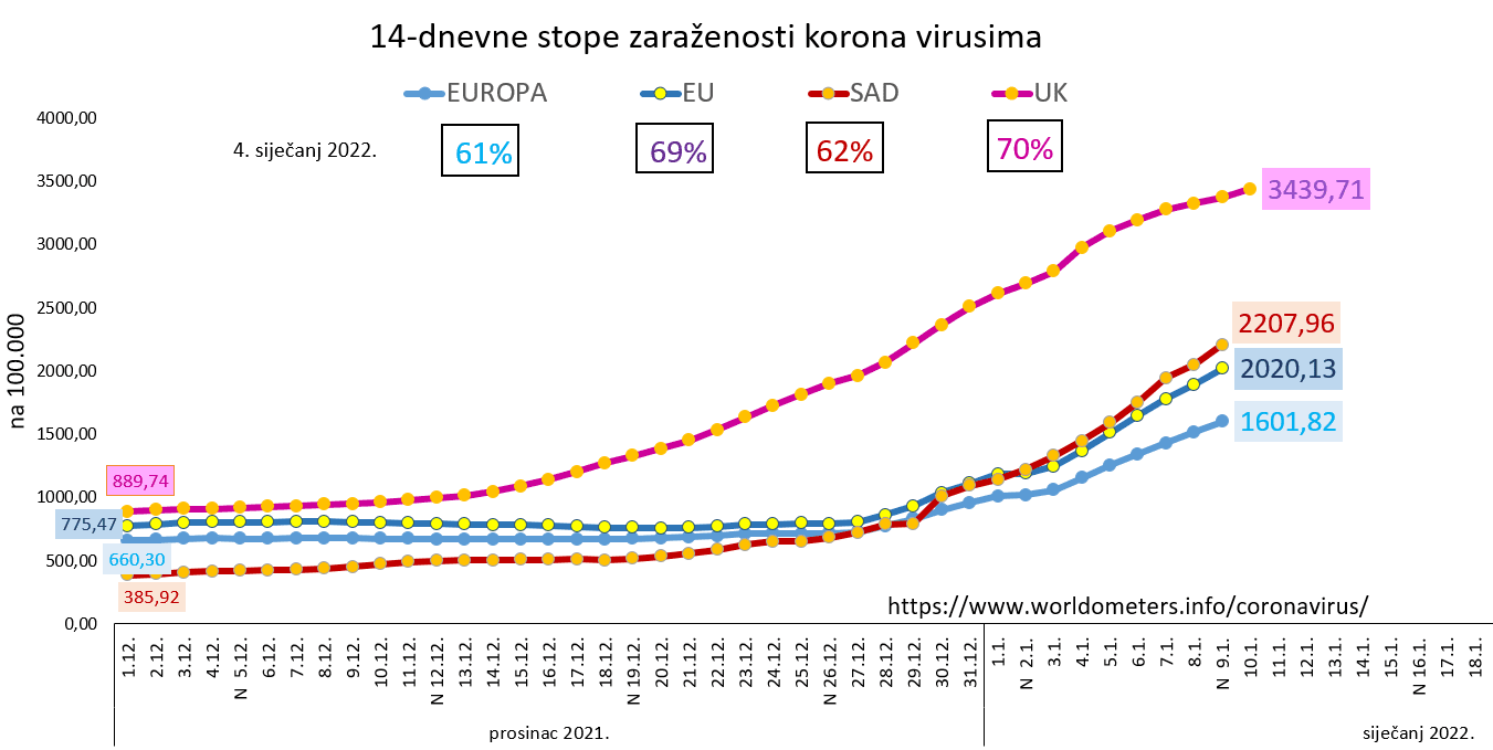 Daleko najveću stopu zaraženosti ima Ujedinjeno Kraljevstvo (UK) koje ima i najveći obuhvat procijepljenosti kako to pokazuju uokvireni postoci na grafikonima. Prikazano je stanje procijepljenosti na dan 4. siječanj 2022. Kod svih prikazanih povećanje broja zaraženih je još veoma izraženo osim što se u UK uočava izvjesno usporavanje. Za lakšu orijentaciju stope zaraženosti iskazane ne 100.000 stanovnika prikazane su u postocima: UK 3,44%; SAD 2,21%; EU 2,02%; Europa 1,60%. Dok su u UK na 100 stanovnika zaražene više od tri osobe u SAD više od dvije, u EU dvije te u čitavoj Europi jedna i pol osoba.