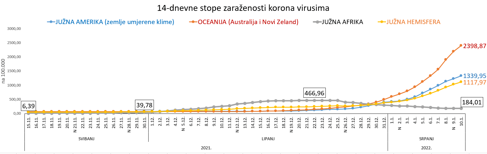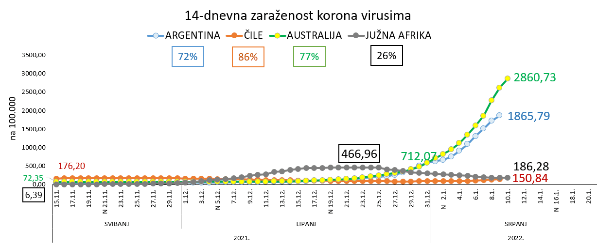 Ondje gdje je Omikron soj počeo svoj pohod u JAR 14-dnevna stopa zaraženosti sada skoro dva mjeseca od početka je vratila se blizu ljetne vrijednosti zaraženosti koronama. Ovakav strelovit uzlet zaražavanja i nešto polaganiji put ka smanjivanju zaraženosti u trajanju od samo dva mjeseca viđa se kod epidemija gripe.