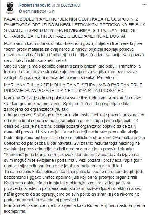 udruga u gradu Splita) gdje je ona imala dosta ljudi koje poznaje,a sa nekim od njih je imala dobre odnose,zamoljena da ne istupa javno sljedecih 3-4 dana od kada je na brzinu poslije pozara organizator objavio da ce za 4 dana biti prosvjed ! Nisu zeljeli da na bilo koji nacin tako plemenita akcija bude obilježena politicki ili bilo kojom politickom strankom! Ova molba je bila upuceno od par osoba u par navrata! Svi znamo rezultat toga njezinog ne svojatanja prosvjeda gdje je cijeli grad pricao da je to prosvjed stranke "Pametno" jer je Marijana Puljak svaki dan do prosvjeda davala izjave na svim mogućim televizijama i portalima u vezi pozara i prosvjeda "Split gori" unatoc i sljedecih par dana gdje je bila zamoljena da ne radi to !
