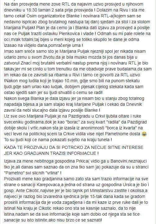 Na dan prosvjeda mene zove RTL da najavim uzivo prosvjed u njihovom dnevniku u 18:30 taman 2 sata prije prosvjeda ! Dolazim na Rivu i sta me tamo ceka! Osim organizatorice Blanke i novinara RTL-a(kojem sam se nedavno ispricao zbog brutalnog nastupa taj dan) sjedam za stol i za stolom Marijana Puljak! Plan je da cemo ja i Blanka dati izjavu za prosvjed a poslije nas ce Puljak traziti ostavku Plenkovica i vlade ! Odmah su mi pale rolete na oci,mrak totalni,taj bijes u meni kojeg se toliko skupilo te dane je odma izasao na vidjelo dana,pomračenje uma !