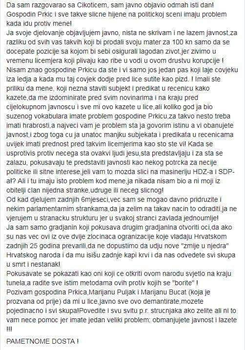 Nisam znao gospodine Prkicu da ste i vi samo jos jedan pas koji laje covjeku iza ledja a kada mu taj covjek dodje pred lice sutite kao pizd. ! Imali ste priliku da mene, koji nezna staviti subjekt i predikat u recenicu kako kazete,da me izdominirate pred svim novinarima i na kraju pred cijelokupnom javnoscu i sve mi ovo kazete u lice,ali koliko god ja bio suzenog vokabulara imate problem gospodine Prkicu,za takvo nesto treba imati hrabrosti,a najveci vam je problem sta ja govorim istinu a vi obanujete javnost,i zbog toga cu ja unatoc manjku subjekata i predikata u recenicama uvijek imati prednost pred takvim licemjerima kao sto ste vi! Kada se usprotivis protiv necega sta ovakvi ljudi jesu,sta predstavljaju i za sta se zalazu, pokusavaju te predstaviti javnosti kao nekog potrcka za necije politicke ili sitne interese,jeli vam to mozda slici na masineriju HDZ-a i SDP-a!? Ali i tu imaju isto problem kod mene,ja nikada nisam bio a ni moji iz obitelji clan nijedna stranke,udruge ili neceg slicnog!