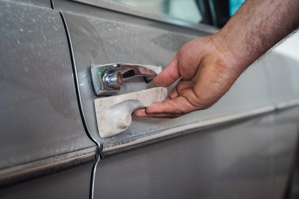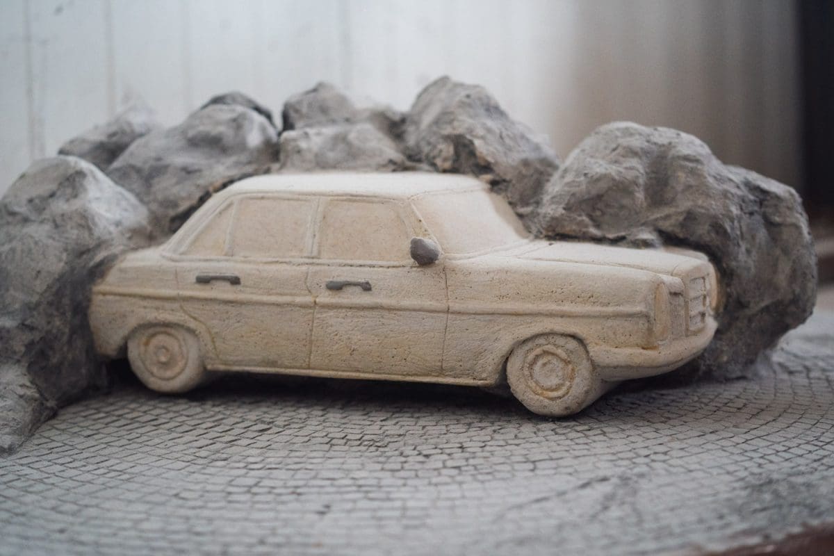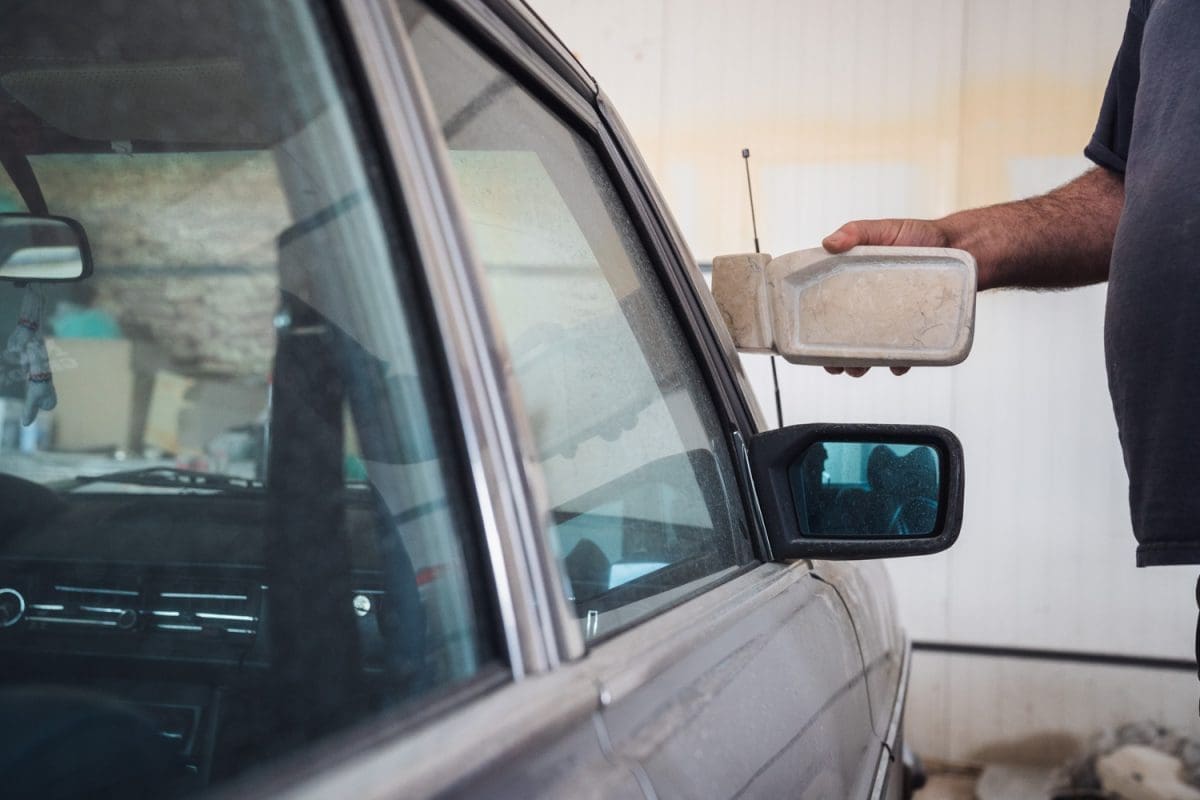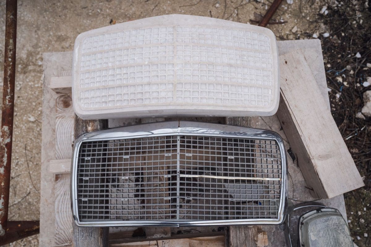 Sve je započeto, još ostaju zadnja hauba i štopovi. Žene će odraditi to. Evo pogledajte ovaj retrovizor, ko bi to mogao tako napaviti i ovu ručicu, ta finoća, ta izrada“; pokazuje nam ručicu nastalu iz kamena i prislanja je uz original srebrnu ručicu ćaćinog mu Mercedesa.