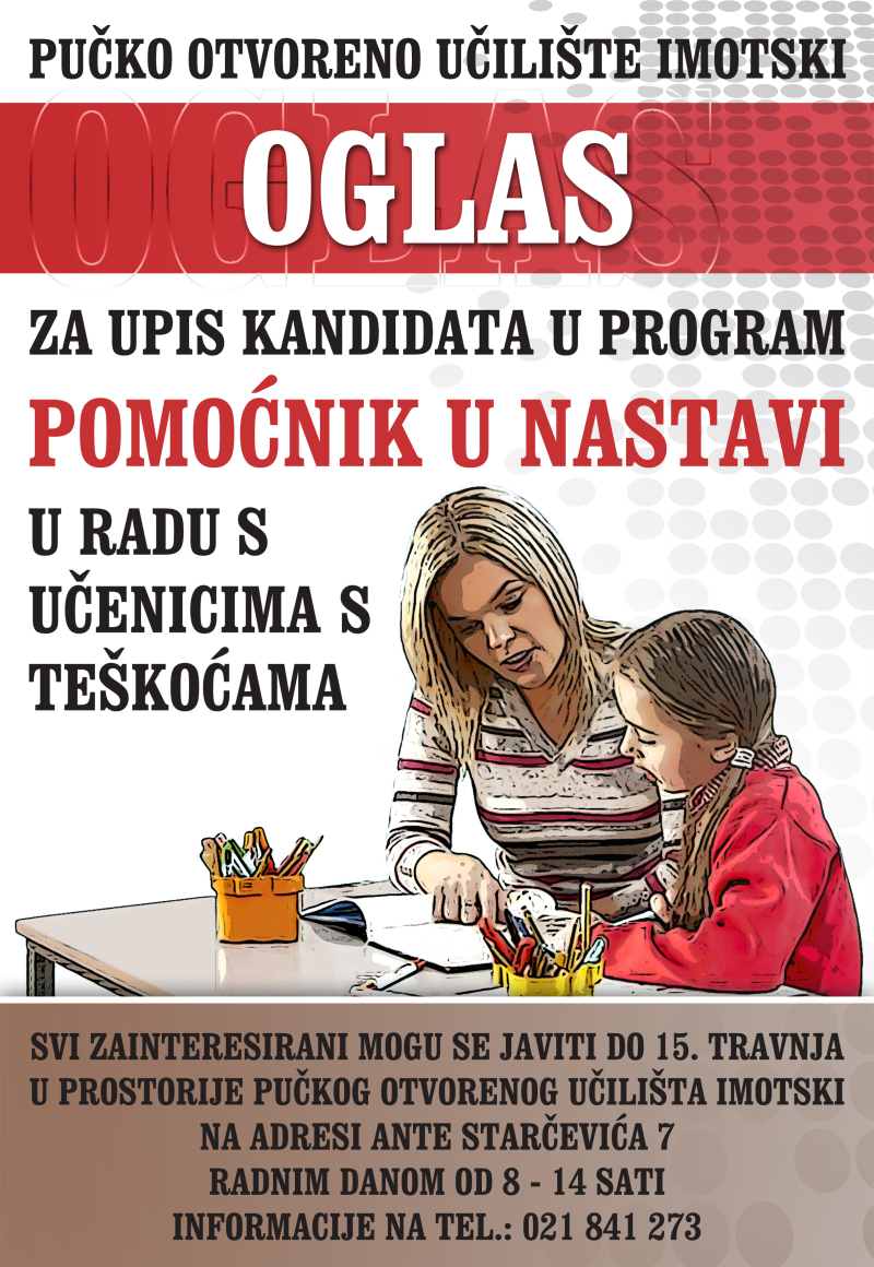 Pučko otvoreno učilište Imotski (POU Imotski) upisuje kandidate u program “Pomoćnik u nastavi u radu s učenicima s teškoćama”.