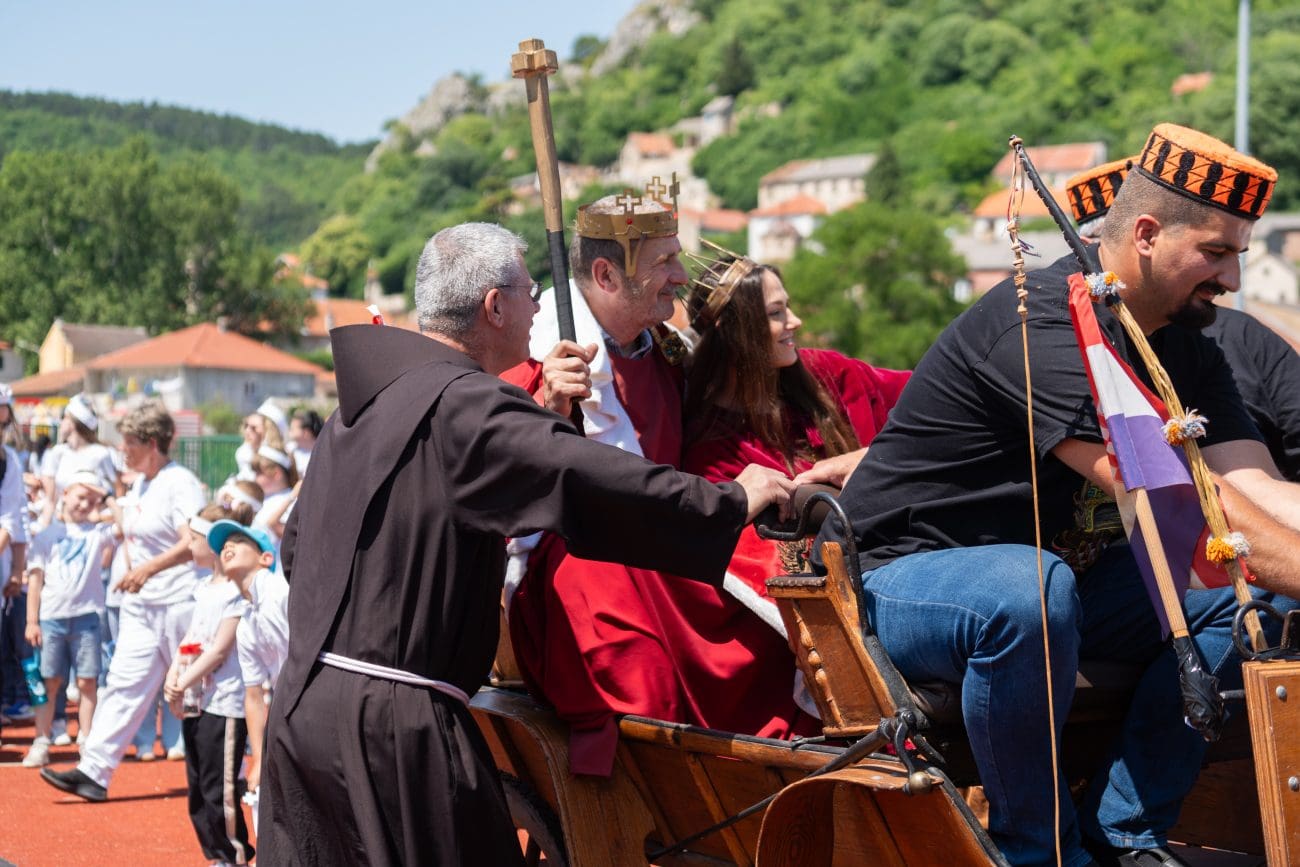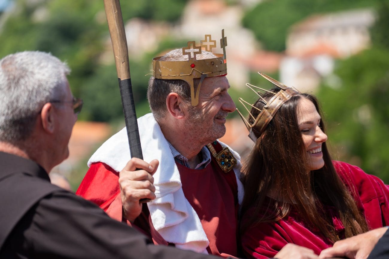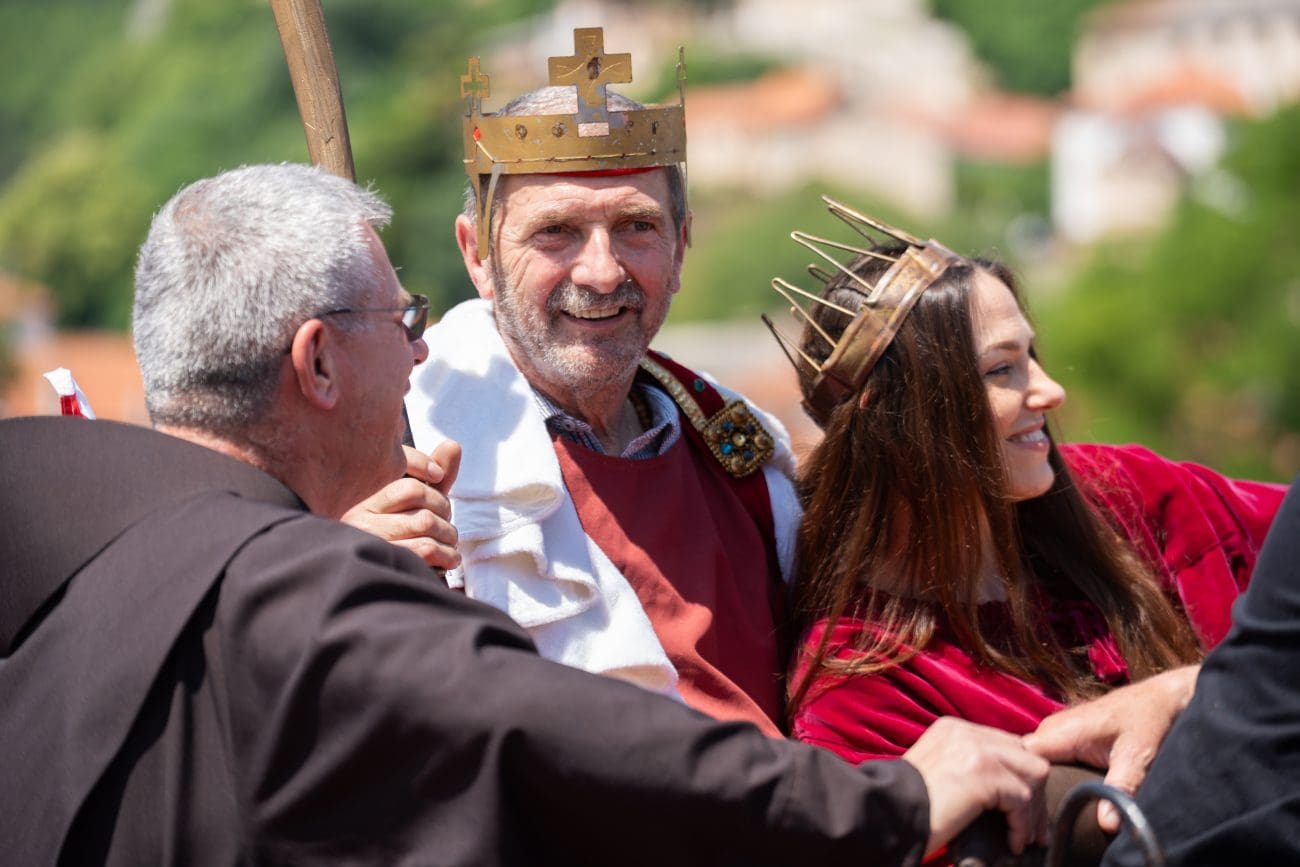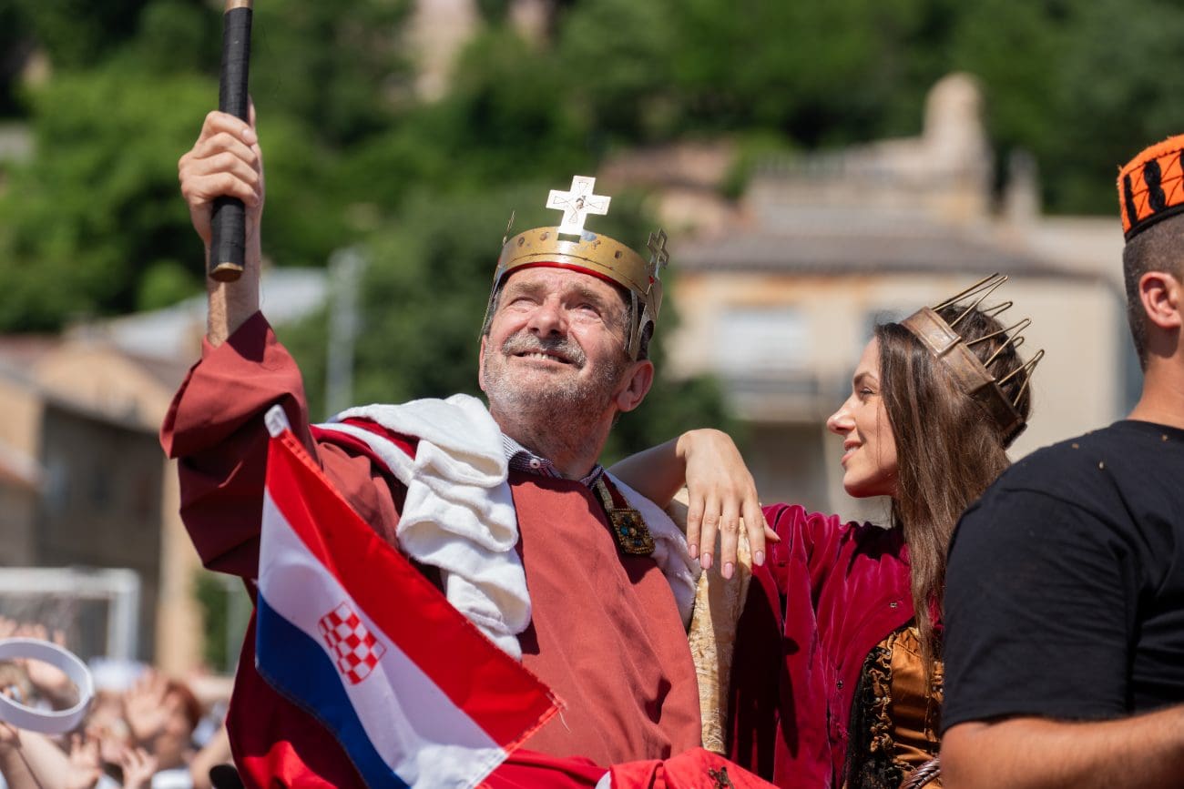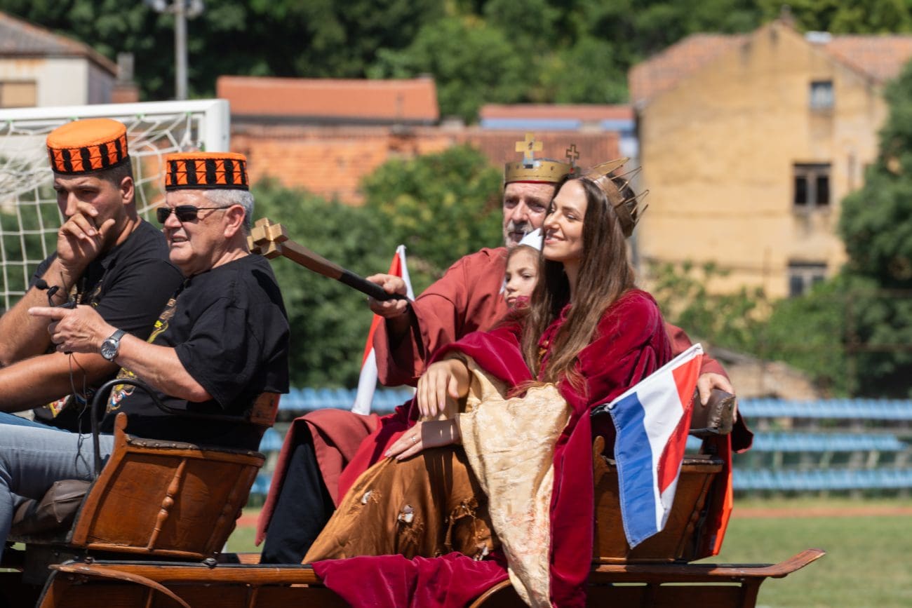Poseban trenutak proslave bio je mimohod povijesnih postrojbi od Trga do Crkve Gospe Velikoga Hrvatskoga Krsnog Zavjeta, predvođen kraljevskom kočijom u kojoj su pristigli kralj i kraljica sa svojom pratnjom. U ulozi kralja Dmitra Zvonimira bio je upravo Tadić Šutra, dok je kraljicu Jelenu utjelovila glumica Barbara Alilović. Par je u kočiji s dva konja stigao pred crkvu, oživjevši tako važan povijesni trenutak.