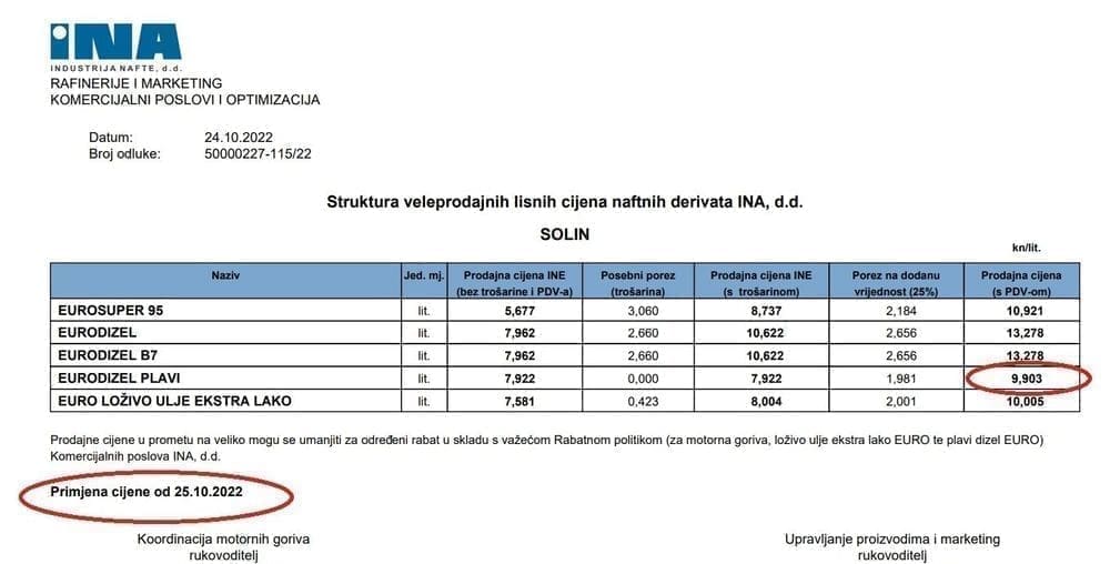 Nevjerojatna situacija dogodila se nakon posljednjeg poskupljenja goriva koje se dogodilo prije dva dana, uslijed odluke Vlade da ovaj put neće intervenirati u ništa, osim plavog dizela, čiju je cijenu zadržala na 8.49 kuna. Unatoč tome, INA je, čini se, samoinicijativno odlučila podići cijene, pa prema cjeniku kojeg imamo u posjedu, to gorivo od jučer košta čak 9,90 kn i to po veleprodajnoj cijeni, piše Morski.hr.
