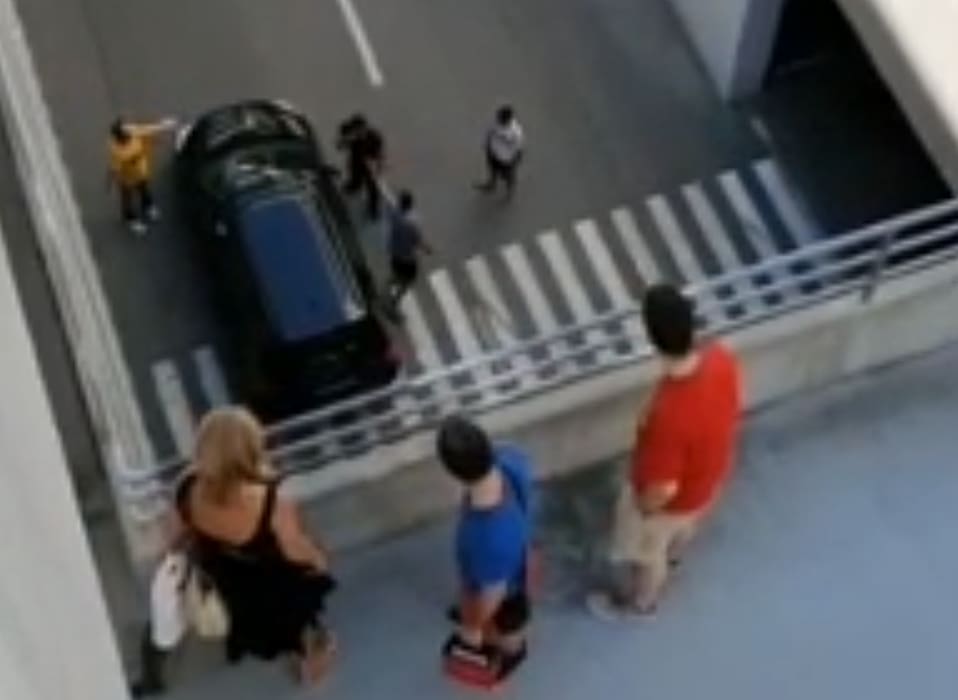 Oko automobila kruže i povremeno se hvataju dva muškarca od kojih je jedan očito iznimno ljut na drugog te viče: "Šta si mi ditetu napravio?!". S obzirom da je jedan od muškaraca bio vidno uzrujan, scena je privukla pozornost brojnih prolaznika ovog trgovačkog centra koji su se zatekli vani.