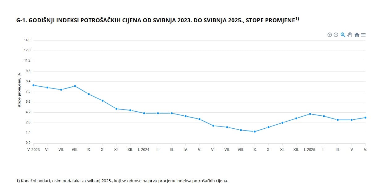 Najveći godišnji doprinos inflaciji došao je iz usluga (+6,2 %) i komponente hrane, pića i duhana (+5,1 %), dok je energija, usprkos globalnom smirivanju cijena, i dalje rasla 1,7 %. Na mjesečnoj razini upravo su hrana (+1,2 %) i usluge (+0,6 %) pogurale ukupni indeks naviše, dok su se energetske cijene spustile za –1,1 %., objavio je danas Državni zavod za statistiku.