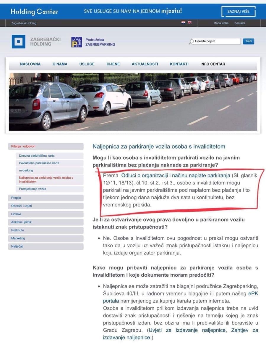 „Parkirna mjesta označena za parkiranje vozila osoba s invaliditetom, a koja imaju izdan uredan znak pristupačnosti sukladno Pravilniku o znaku pristupačnosti (NN 78/08 i 87/14) moraju biti oslobođena od svake naplate pa tako i na označenim parkirnim mjestima unutar zatvorenih parkirališnih površina. Stoga Vas pozivamo i preporučamo da učinite sve sukladno svojim ovlastima kako bi se osigurala pristupačnost i mobilnost osobama s invaliditetom te da tom prilikom uzmete u obzir i pozitivne prakse iz drugih krajeva Hrvatske, a kako se ne bi kršila prava osoba s invaliditetom“.