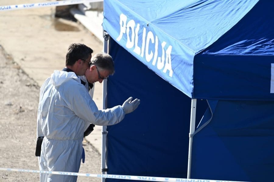 Ispred kuće u kojoj je vjerojatno živjela obitelj policija provodi očevid. Ondje je parkiran i automobil Mercedes, koji je ograđen policijskom trakom.