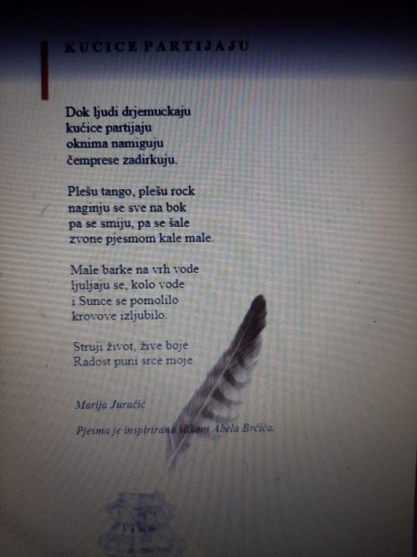 Sve se na slici kreće, sve igra, pleše. Plešu kuće, njišu se čempresi , ljulja se more, valovi s barkama, borovi s brdima. Sve je rekao bih raspjevano. Kako najčešće slikam kuće, uvale, barčice - naziv izložbe sam se nametnuo. Nastojim zabilježiti trenutak vremena, bljesak ljepote, zaustaviti i ovjekovječit uvijek pozitivnom energijom. Kako sam već naveo, ova izložba nastala je u protekle dvije godine, i gotovo svi radovi su iz tog vremena. Izuzetak je jedna slika, koju sam ustupio na poziv riječkih književnika kojima je moja slika poslužila kao poticaj i inspiracija za pjesme. Više njih koje su nastale uz sliku bit će izložene i na izložbi.