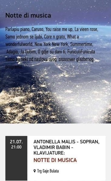 Čini se da je Hrvatsko narodno kazalište u Splitu pronašlo tajni recept kako zadovoljiti sve ukuse pomnim odabirom programa, koji samim svojim nazivima i protagonistima daju jake argumente da se neće potonuti ni pred publikom ni pred umjetnošću. Jedan od dobrih argumenata i povoda je i koncert pod nazivom Notte di musica, koji će se večeras, 21. srpnja održati na Trgu Gaje Bulata.