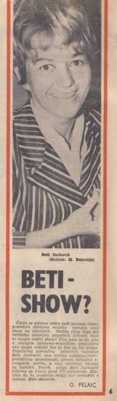 Da su mi svi oni pusti razgovori koje sam u životu vodio bili tako ugodni (ne samo novinarski), život bi bio ljepši i veseliji. Neki su bili musavi, neki su bili pristojni, neki su se pravili važni… I tako to… Baš sam zadnjih dana mislio kako o sjajnoj pjevačici Beti Jurković nisam godinama ništa pročitao. A ni napisao! Povukla se iz glazbenog života vlastitom odlukom. A kako sam znao da je sklona šalama, nazovem je i kažem: „Gospođo Beti, ja sam vam onaj lipi, mladi, zgodni, visoki crni momak šta Vam je tamo neke davne godine u ljetnom kinu Bačvice dao ruku da se lakše na „uzbrdici“ popenjete do izlaza!“