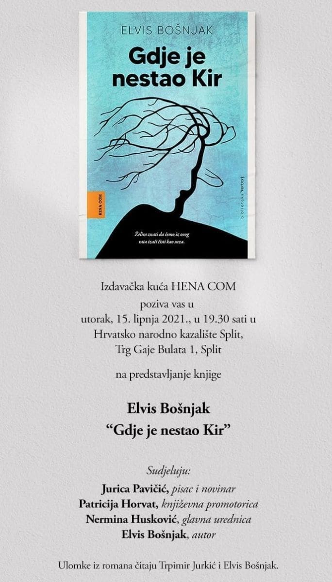 I dramski i televizijski i filmski glumac - sve to se nepotrebno piše, kako bi u tekstu bila koja rečenica više. I ono dramski pisac, a sad i romanopisac! Po meni bi trebalo samo reći Elvis Bošnjak, čovjek ovdašnji, koji radi i stvara u vremenima nesklonim prepoznavanju istinskih vrijednosti; Čovjeka, Glumca i Pisca, što nam ga darova ovo podneblje. Sad je na nama da sve to skupa smjestimo u prikladni okvir. Najbolje bi bilo obojiti zlatnom bojom, kako bismo sjajem izdvojili banalnosti od stvarnih vrijednosti. Taj Elvis, koji ima slavno ime, „drznuo se“ pozvati potpisnika ovih redaka na predstavljanje svog romana Gdje je nestao Kir, 15. lipnja u splitskom HNK, nekoliko dana prije nego ćemo proljeću reći zbogom. Ni slutio nije taj Elvis kako je taj poziv primljen kao najfinija gesta. I rekoh, idem upitati tog Elvisa, za kojega držim da je nešto najbolje što smo dobili u sferi kulture u protekla dva, tri desetljeća, idem ga upitati, onako naivno:
