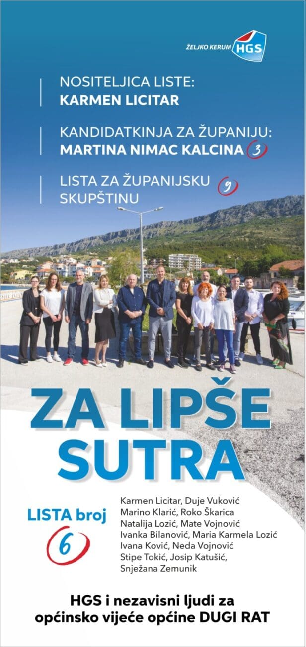 Karmen Licitar – nositeljica liste HGS-a za Općinsko vijeće Dugi Rat – poručuje: "Mi smo tu zbog vas i za vas. Glas za nas – glas je za konkretnu promjenu."