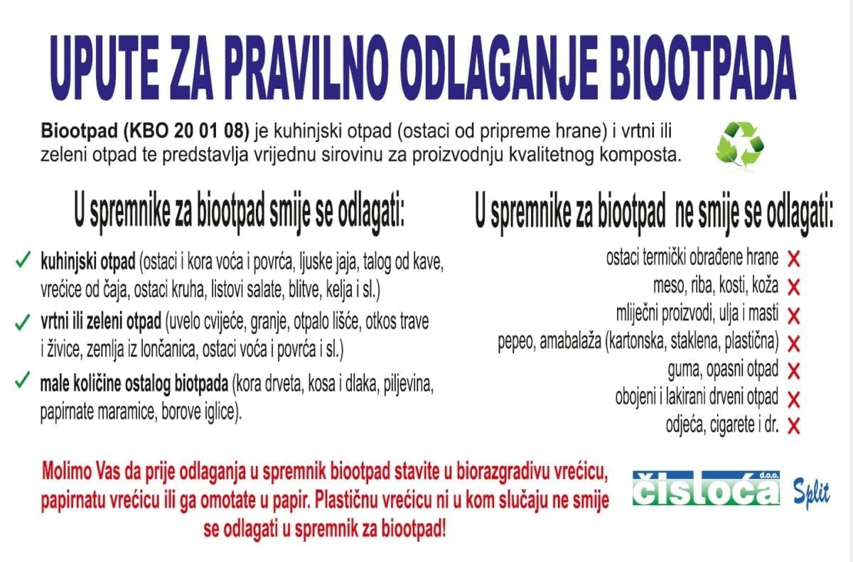 Za odlaganje biootpada u Splitu postoji ugovor s dvije tvrtke. Radi se o manjim količinama čistog biootpada koji se prikuplja od restorana i trgovačkih lanaca. Naime, biootpad po kontejnerima je još uvijek onečišćen.