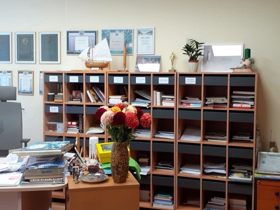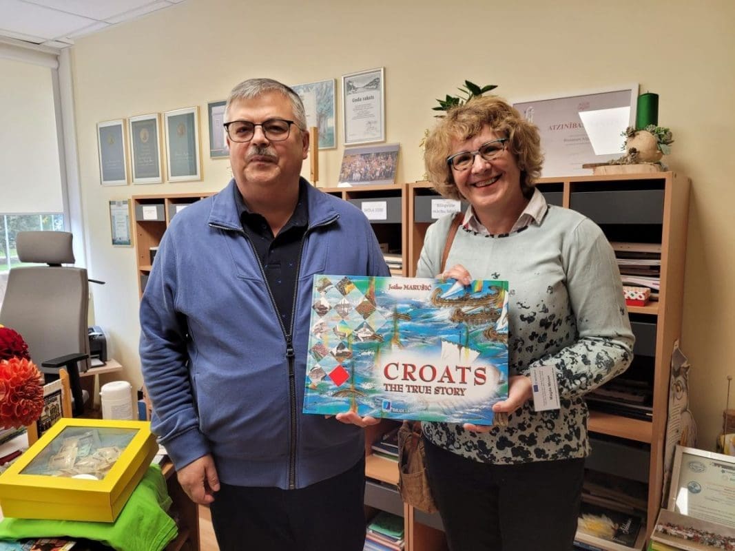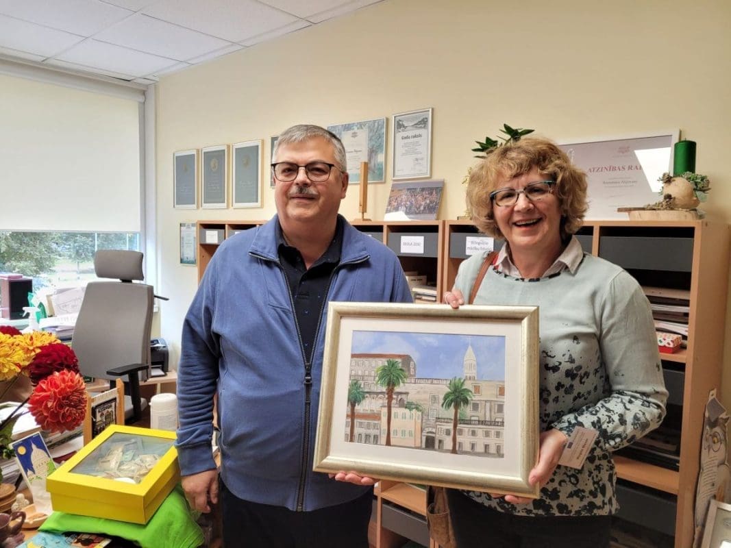-Čekajte! Uručili smo ravnatelju braceru, koju je odmah ostavio u svojoj sobi. Puno mu se svidjela. Inače su Latvijci fascinirani radovima naših učenika. Poklonili smo mu za školu sliku, pogled na palaču s mora, rad Marte Vladušić (sadašnje studentice arhitekture);crtež trogirske katedrale u olovci Ante Dražena Tranfića (sadašnjeg studenta arhitekture u Splitu);brošure Graditeljsko geodetske tehničke škole, majicu našeg projekta sa siluetama Splita i Rige smo poklonili njihovom ravnatelju, knjigu The Croats –ilustriranu povijest Hrvatske autora Joška Marušića smo poklonili za knjižnicu.