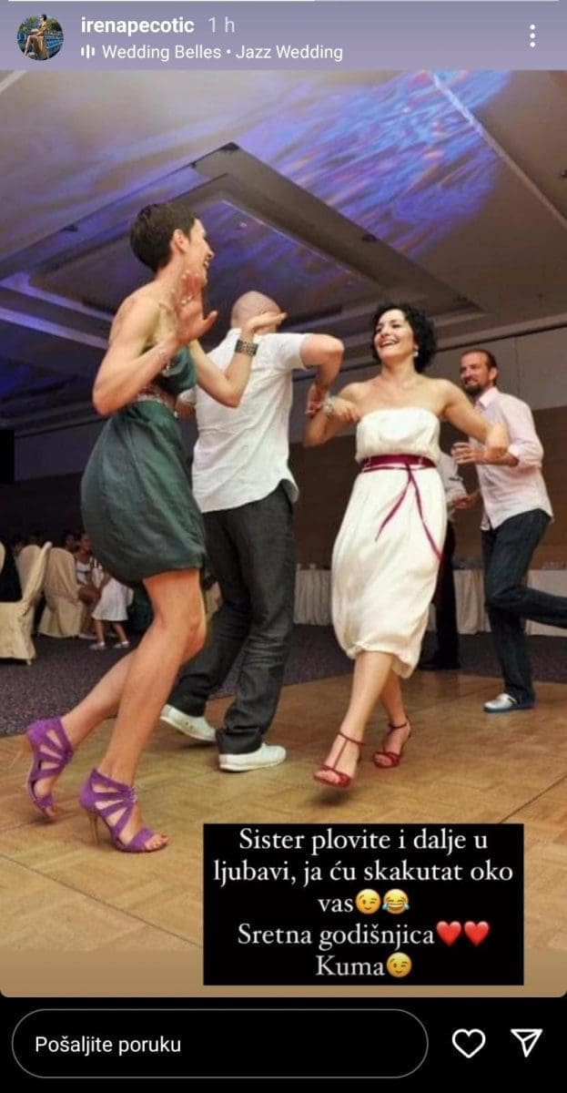 "Sister, plovite i dalje u ljubavi, ja ću skakutati oko vas. Sretna godišnjica. Kuma", napisala je Irena uz fotografiju na kojoj plešu.