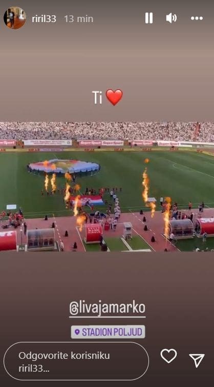 Potom je objavila i video ulaska igrača na stadion. Na njemu je označila supruga Marka i napisala: "Ti", uz emotikona srca.