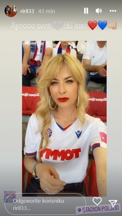 Iris je na stadion stigla dotjerana. Obavila je nekoliko videa s tribina, ali i video na kojem se vidi da je odjevena u dres uz kompletni make up i crveni ruž te nova frizuru.