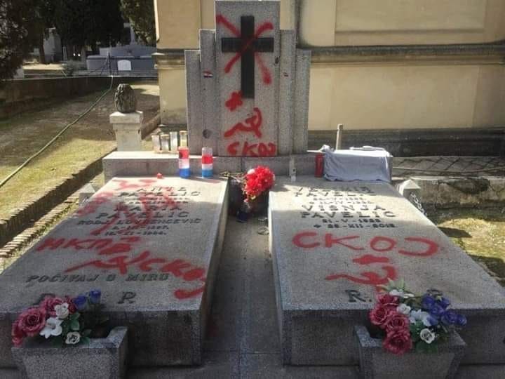Kao što se vidi na poslanoj fotografiji, grobnica u kojoj su pokopani dr. Ante Pavelić, njegova supruga Mara, sin Velimir i kćer Višnja Pavelić, je oskrnavljena grafitima ispisanim na ćirilici te komunističkim simbolima srpa i čekića. Na nekoliko mjesta na ćirilici je ispisana i skraćenice SKOJ, a koja znači Savez komunističke omladine Jugoslavije.