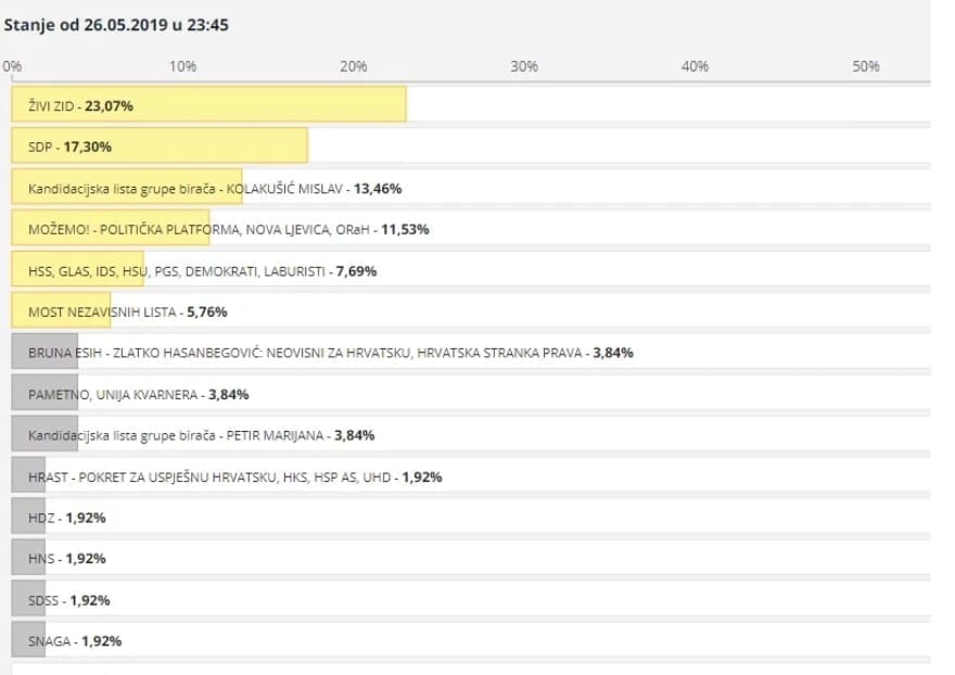 Najviše glasova dobio je Živi zid - 12 glasova odnosno 23,07 posto. Drugi je SDP koji je skupio 9 glasova ili 17,3 posto. Na trećem mjestu je lista Mislava Kolakušića koja je dobila 7 glasova. Četvrta je stranka Možemo sa šest glasova. Peta je Amsterdamska koalicija koja je skupila četiri glasa. Slijedi Most koji je skupio tri glasa u Irskoj.