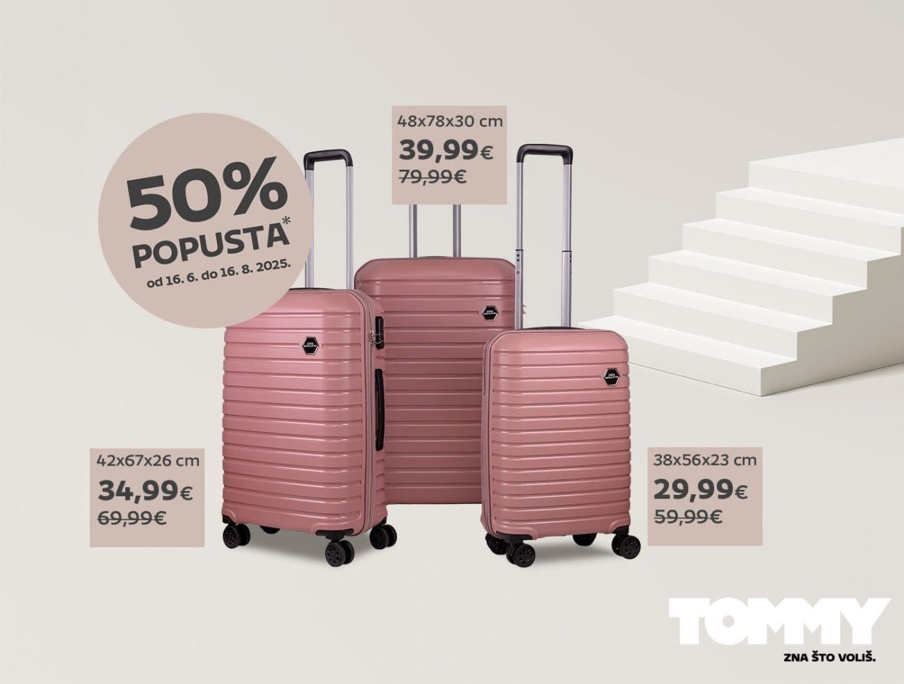 U periodu od 16. 6. do 16. 8. u odabranim Tommy prodavaonicama pronađi putne kovčege uz 50% popusta.
