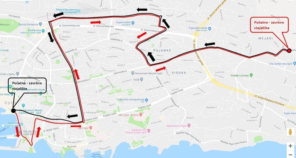 Novo stambeno naselje Kila – Vukovarska ulica – Velebitska ulica – Zagorski put – Sarajevska ulica – Hercegovačka ulica – Dubrovačka ulica – Poljička ulica – Zvonimirova ulica – obala Lazareta (taxi stajalište na Rivi).