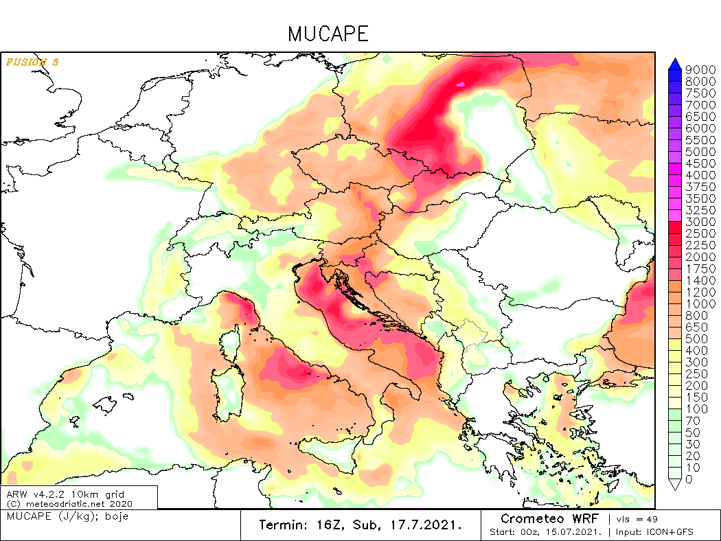Uz spomenute temeljne sinoptičke uvjete, nad regijom će kružiti prilično nestabilna zračna masa (modelirane vrijednosti nad Jadranom, MLCAPE > 1000 J/kg u subotu te mjestimično > 2000 J/kg u nedjelju, MUCAPE moguće i do ~ 3000 J/kg; uz temperaturu rosišta do 23°C). Prema NWP modelima ne očekuje se značajno vertikalno smicanje u sloju 0-6 km što bi trebalo ograničiti razvoj konvektivnih sustava vjerojatno do multićelijskih tipova, no uz nešto povećano smicanje donjih slojeva (ponegdje iznad 15 m/s 0-1 km) i spiralnost ponegdje preko 500 m2/s2, čini se da nije isključena mogućnost mjestimičnog razvoja morskih pijavica. Pojava lokalne tuče je također izvjesna uslijed značajnih CAPE vrijednosti.