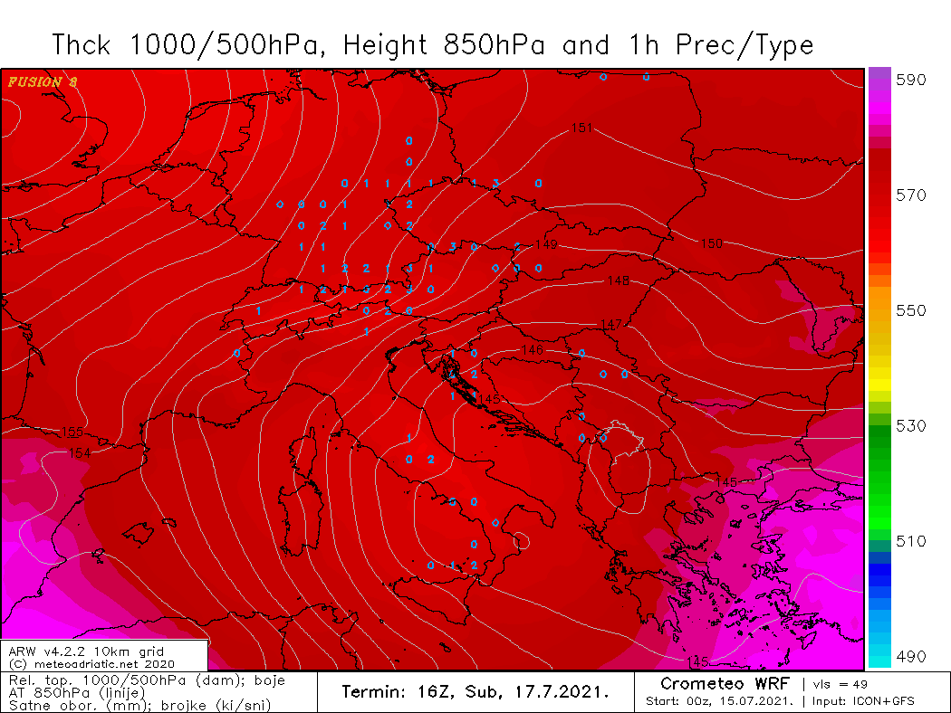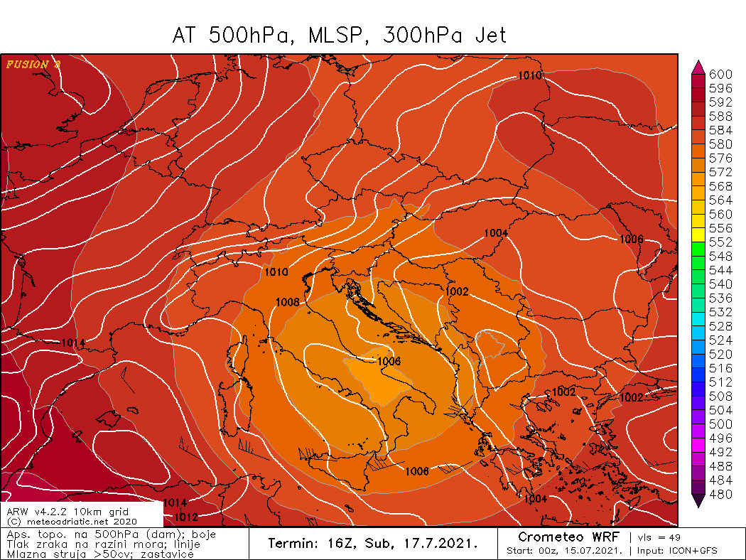 Na gornjim slikama prikazana je generalna sinoptička situacija za subotu poslijepodne. Nad našim krajevima nalazit će se izražen ciklonalni vrtlog koji će se polako premještati prema jugoistoku sa centrom u blizini Jadrana. Sustav će osim u slobodnoj atmosferi imati i dosta dobro definiran prizemni centar niskog tlaka koji će se nalaziti ponešto istočnije u odnosu na visinski centar, što je indikator vjerojatnog jačanja sustava, od petka prema nedjelji. Krajem nedjelje se očekuje okludiranje i postupno slabljenje ciklonalnog sustava.