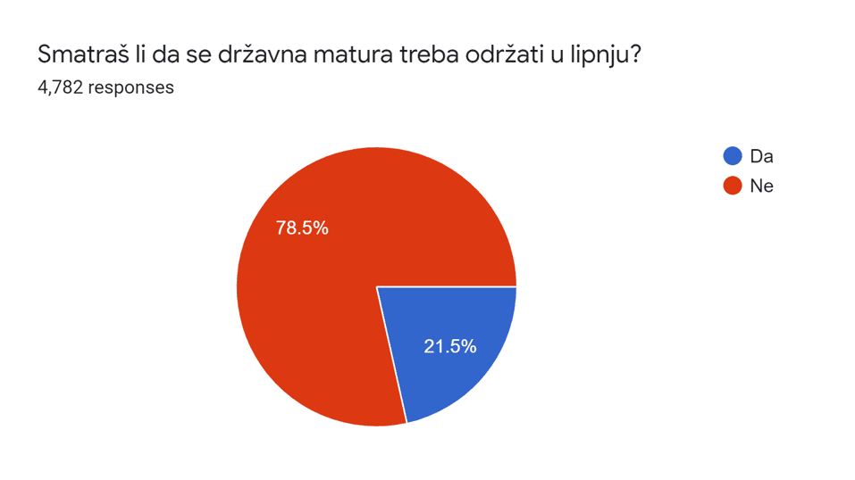 Anketom se htjelo ispitati stavove maturanata o tome kada bi se matura trebala održati, prema do sad predloženim scenarijima koje smo mogli posljednjih dana čuti u javnosti. Većina ispitanika, njih čak 78,5% smatra kako se ispiti iz mature ne bi trebali održati u lipnju, dok njih 21,5% smatra da bi se matura tada trebala održati.