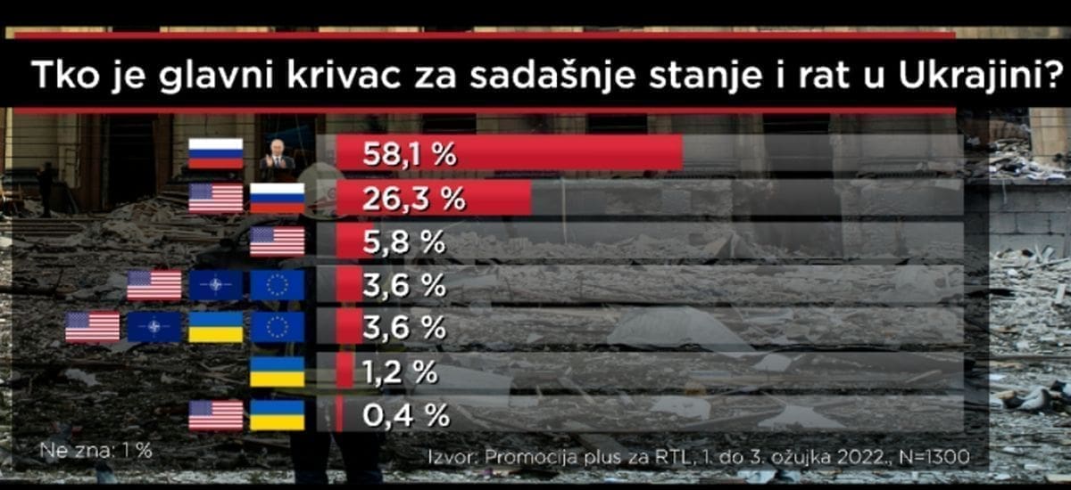 Većina građana, njih 58,1 posto misli da su Rusija i ruski predsjednik Putin glavni krivci za sadašnje stanje i rat u Ukrajini. Zanimljivo, oko toga se većinski slažu i birači vodećih desnih i lijevih hrvatskih stranaka.
