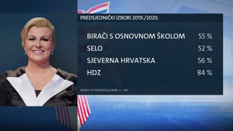 Predsjednica ima veliku potporu među biračima s osnovnom školom (55%), zatim na selu (52%). Veću potporu ima kod birača na Sjeveru Hrvatske (56%) i, naravno, kod birača HDZ-a (84%).