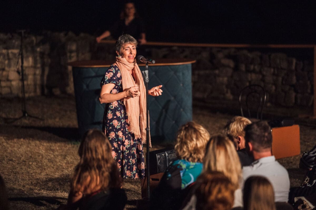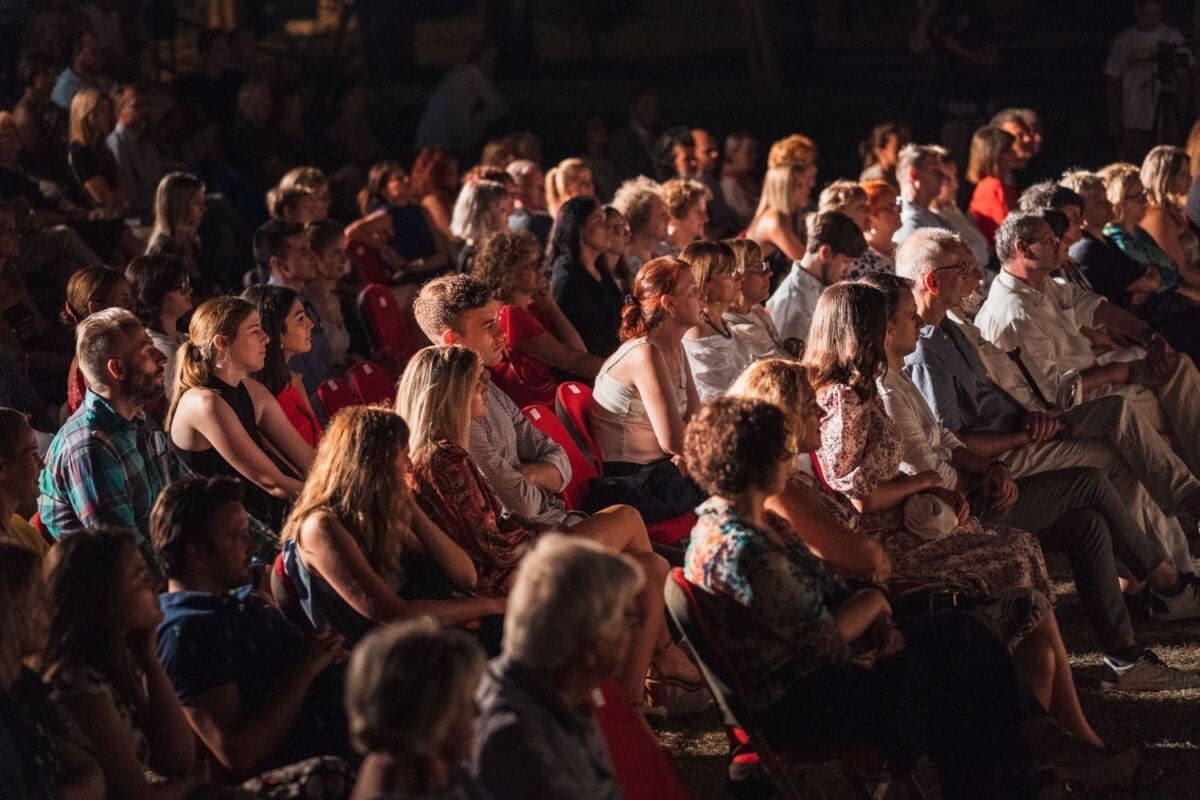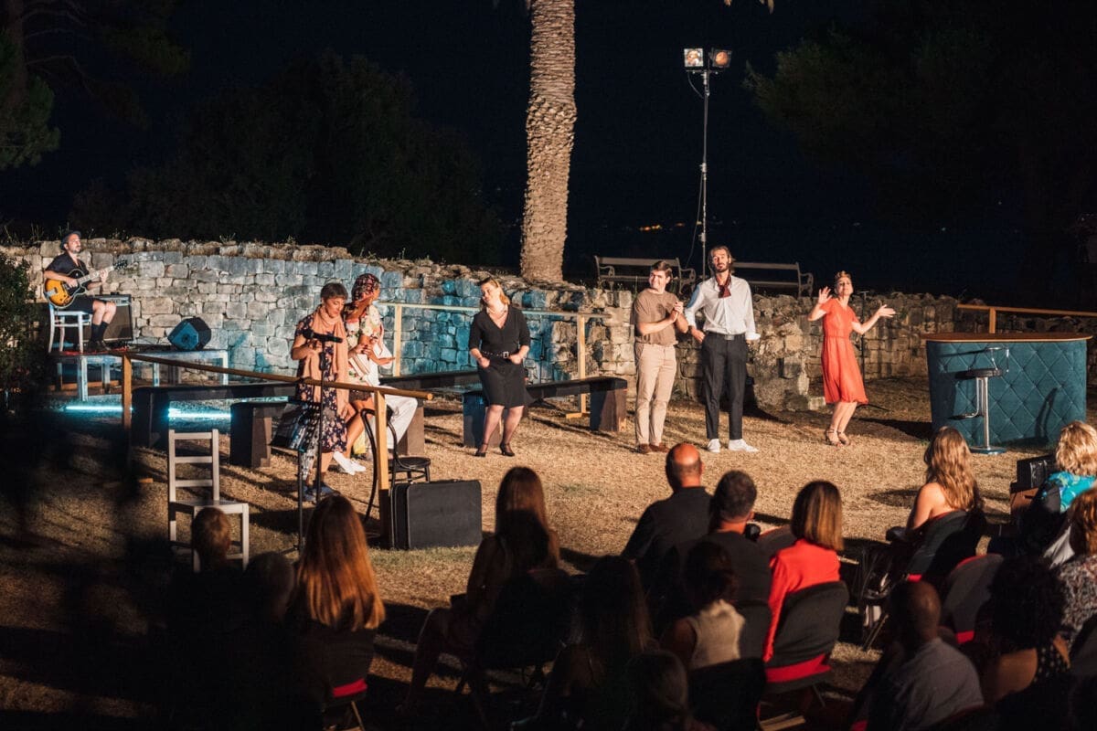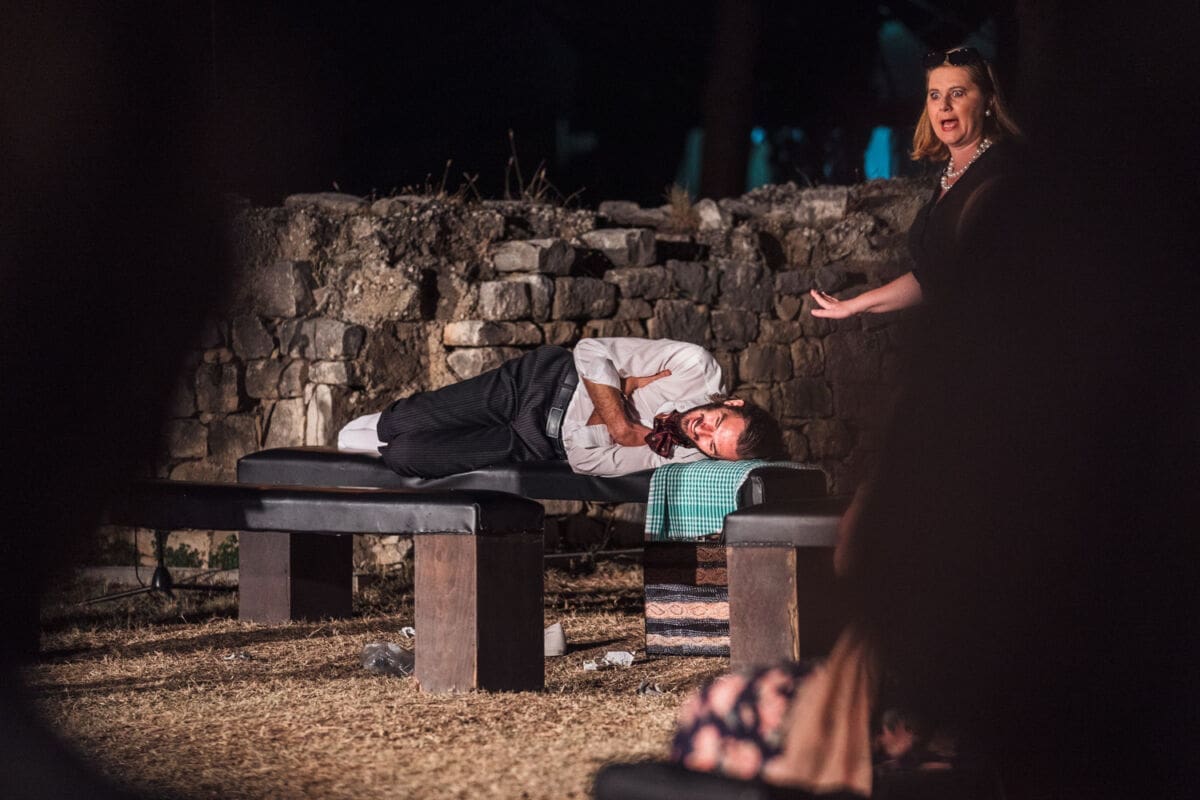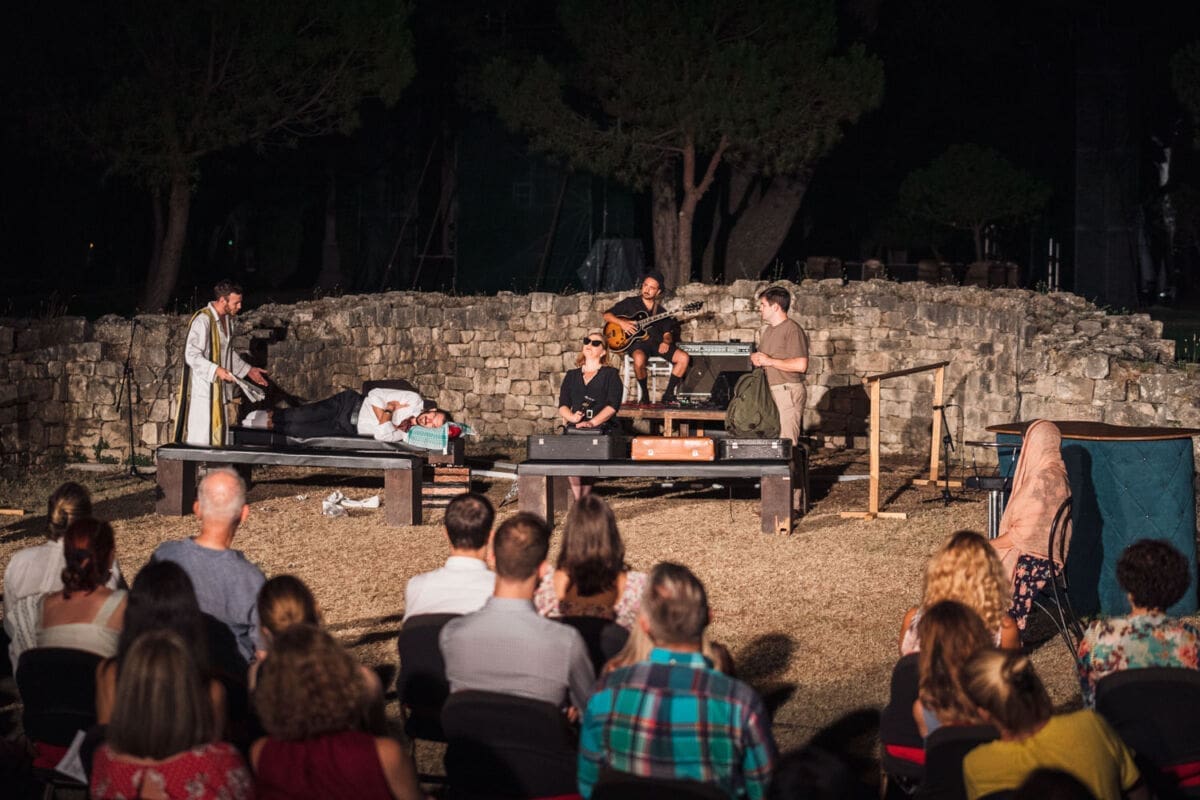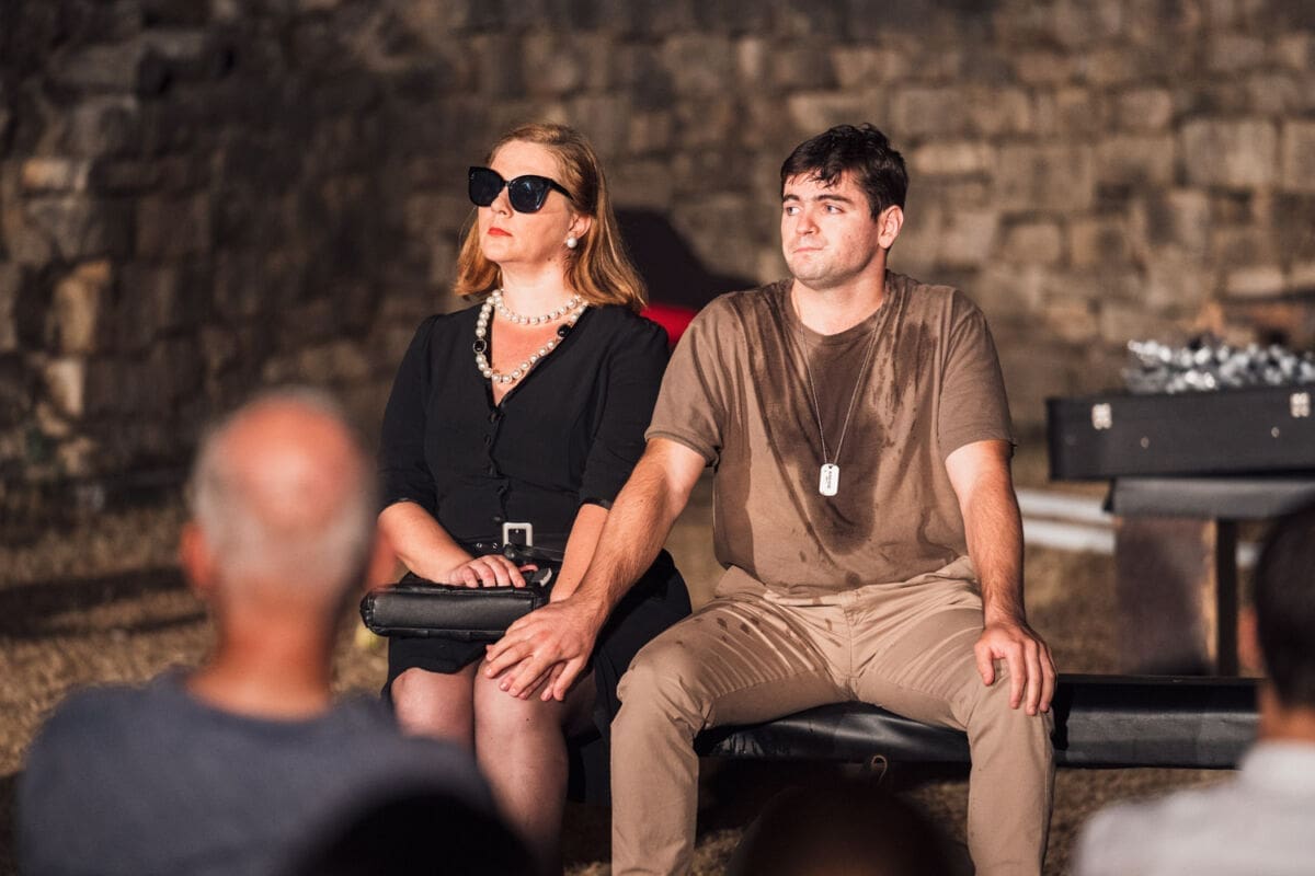 Glavni likovi koji grade priču prikazanu u prelijepom ambijentu Sustipana su činovnik, supruga, kratkovidna žena, kupačica, vojnik i putnik (Pere Eranović, Vanda Boban Jurišić, Lidija Florijan, Ana Gruica Uglešić, Nada Kovačević, Luka Čerjan, Mijo Jurišić) te prisutna inspicijentica Tina Munivrana Novković. Njihov konstantan poriv za kretanjem, komunikacijom (pa čak i krnjom) i nadasve za ljubavlju čine atmosferu zasićenom, punom titravog čekanja da se nešto rasplete po našim očekivanjima, da neki konkretan događaj ili subjekt razbije šumove u komunikaciji. Međutim, jezik ne dopušta da se svjetlo reflektora baci na događaj, što je dramaturški izuzetno izazovno i sigurno se neće svidjeti svima.