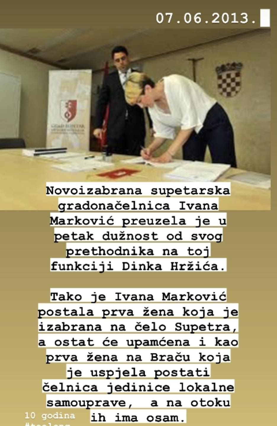 Ivana Marković prije točno 10 godina stupila je na dužnost supetarske gradonačelnice. Tim povodom, napravila je dužu objavu na društvenim mrežama.