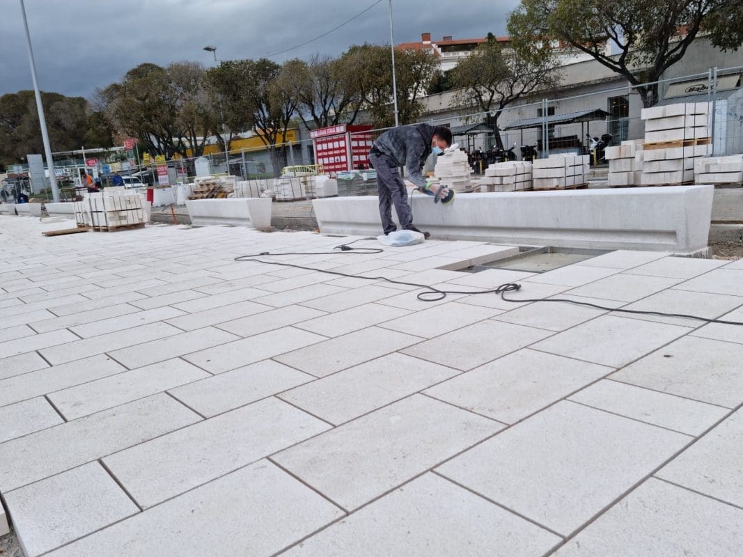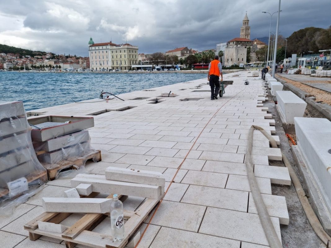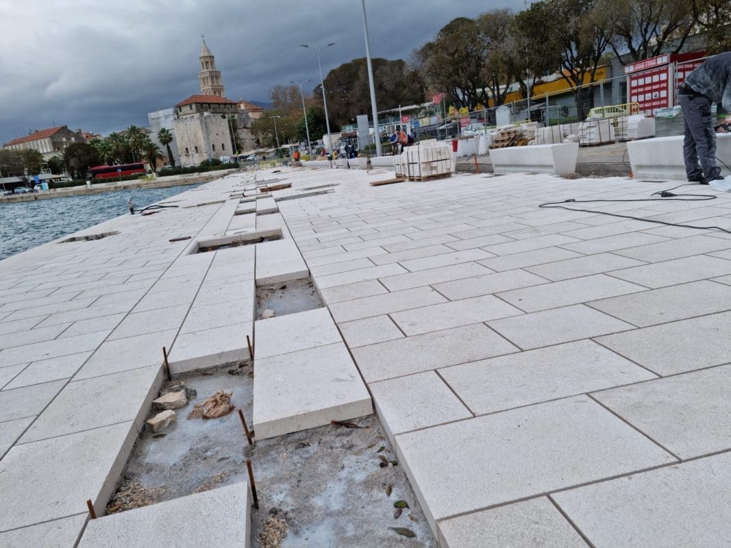 Radi se punom parom i s druge strane ceste koja vodi prema splitskim kolodvorima i trajektnoj luci. Uz obalu se postavljaju kamene ploče koje će dati novu vizuru gradu podno Marjana.