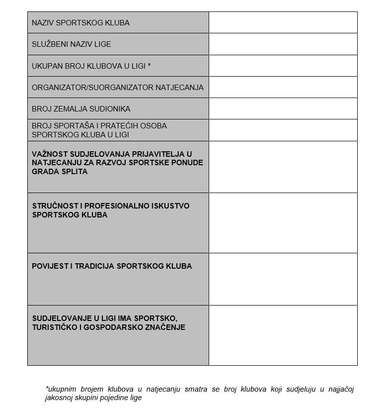 Grad Split: Grad Split nema okviran broj klubova koji bi se ovim Javnim pozivom mogli natjecati.