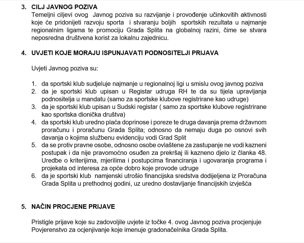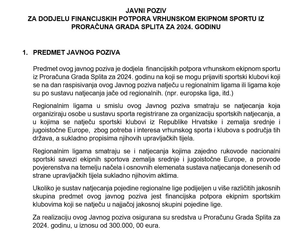 "Ovim pozivom cilj je osigurati financijsku potporu sportskim klubovima koji se natječu u ligama organiziranim na regionalnoj razini ili jačima, poput europskih liga. Regionalne lige definirane su kao natjecanja organizirana od strane tijela registriranih za sportska natjecanja gdje sudjeluju klubovi iz Hrvatske i zemalja srednje i jugoistočne Europe. Svrha poziva je osigurati podršku vrhunskim sportašima i klubovima zbog interesa tih zemalja i njihovih sportskih tijela", javili su prije manje od mjesec dana iz Grada Splita u tekstu Javnog poziva.