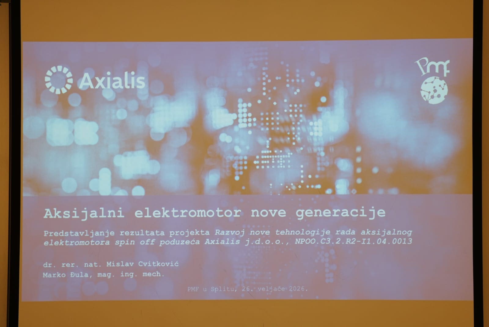 Nakon višegodišnjeg rada na projektu Ministarstva znanosti i obrazovanja "Razvoj nove tehnologije rada aksijalnog elektromotora spin off poduzeća Axialis j.d.o.o.", u sklopu kojeg je osnovana spin-off kompanija Fakulteta, javnosti su predstavljeni rezultati razvoja inovativnog aksijalnog elektromotora i sustava hlađenja.