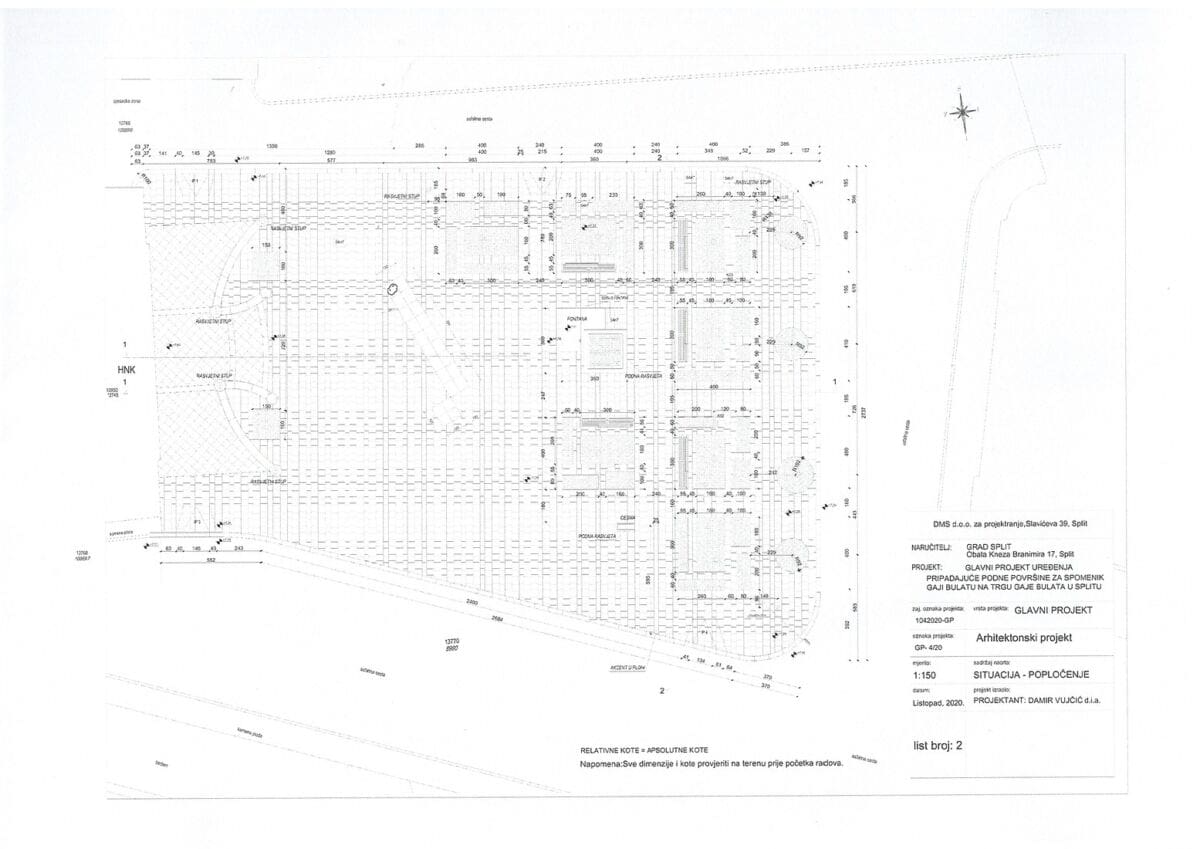 Suprotno navodima koji su se proteklih dana pojavili u medijima – kako je planirano oblaganje podne površine velikim armirano betonskim pločama postavljenim po sistemu šahovskog polja – važno je napomenuti kako će se površina plohe javne površine oko spomenika Gaji Bulatu popločiti kamenim pločama postavljenim u polusuhom mortu na armirano betonskoj ploči prema statičkom proračunu.