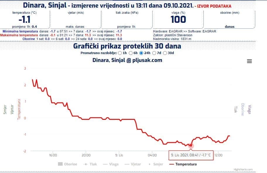 Dok su nam planinari s vrha Svilaje, Bata, dojavili padanje susnježice na samo +1°C, prvi snijeg ove jeseni pada u najvišim predjelima Dinare i Kamešnice.