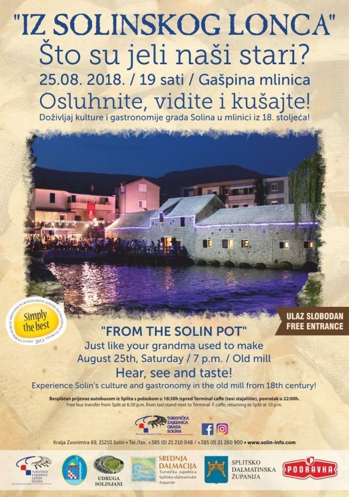 dalmatinske, TZ Splitsko dalmatinske županije te Podravka d.d., zadovoljstvo nam je najaviti manifestaciju “Iz Solinskog lonca – što su jeli naši stari?” koja će se održati u subotu 25.08.2018., osmu godinu zaredom na prostoru Gašpine mlinice s početkom u 19:00 sati. Riječ je o gastronomskoj manifestaciji, dobitnici nagrade Simply the best 2014, priznanja za inventivnost u razvoju turističke ponude, koja se svake godine održava u Gašpinoj mlinici, dobitniku plavog cvijeta HTZ-a za najbolji turistički proizvod, a koja za cilj ima prezentaciju bogate kulturno povijesne baštine, te gastronomskih specijaliteta grada Solina. U programu će nastupiti veterani KUD-a Salona, Klapa Tamarin iz Vranjica, Solinski bubamarci i Galaxy bend.