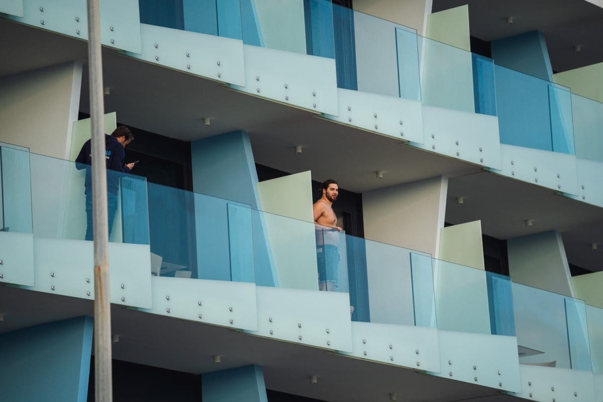 Pred hotelom smo zamijetili policijske snage koje su brinu o sigurnosti vaterpolista, no i Splićanke koje su sa zanimanjem gledale "isklesana" tijela vaterpolista na balkonu hotela...