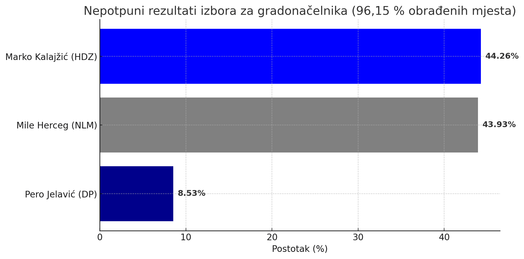 Najviše glasova zasad ima Marko Kalajžić, kandidat HDZ-a, koji je osvojio 934 glasa, odnosno 44,26 posto. Odmah iza njega, s razlikom od svega 7 glasova, nalazi se aktualni gradonačelnik Mile Herceg, kandidat Nezavisne liste, s osvojenih 927 glasova (43,93 %).