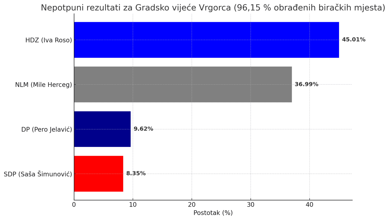 Prema neslužbenim rezultatima s 25 od ukupno 26 biračkih mjesta (96,15 %), u tijesnoj političkoj utrci za Gradsko vijeće Vrgorca trenutačno vodi lista HDZ-a, na čijem je čelu Iva Roso, s osvojenih 45,01 posto glasova, odnosno 921 glas.