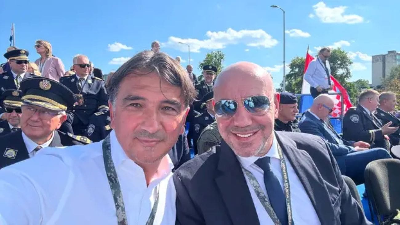 Na fotografiji Dalić pozira u društvu kolege, izbornika hrvatske vaterpolske reprezentacije Ivice Tucka. Obojica su vidno dobro raspoloženi, a u pozadini se vide pripadnici Oružanih snaga i hrvatske zastave koje se vijore snažan simbol zajedništva, pobjede i nacionalnog ponosa.