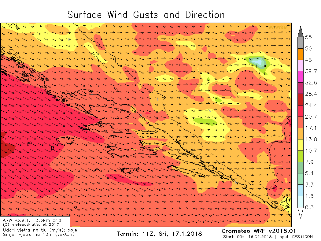 Prva u nizu promjena vremena bit će kratkotrajna, ali snažna. Ovoga puta naglasak neće biti na oborinama koje će biti kratkotrajne, a ponegdje će i potpuno izostati. Noćas i ujutro ponegdje će biti kiše, pljuskova i grmljavine, a u planinama iznad 1300 metara može biti i malo snijega. Ipak, u dijelu Dalmacije zadržat će se suho. Prestanak oborina prvo će zahvatiti sjever Dalmacije, a tek u noći na četvrtak i njen jug. Glavno obilježje vremena u srijedu bit će vjetar! Već noćas jugo i lebić prijeći će u pulenat (zapadni vjetar) koji će na moru biti jak s olujnim udarima. Tijekom jutra pulenat će sve više okretati na tramontanu (NW). Do sredine dana na moru, ali i ponegdje uz obalu udari mogu dosezati, pa i prelaziti 100 km/h. Najjači udari tramontane očekuju se u drugom dijelu dana prema otvorenom moru kada će biti čestih orkanskih udara. Snažan vjetar povećat će valovitost mora, pa se mogu očekivati problemu u pomorskom prometu.