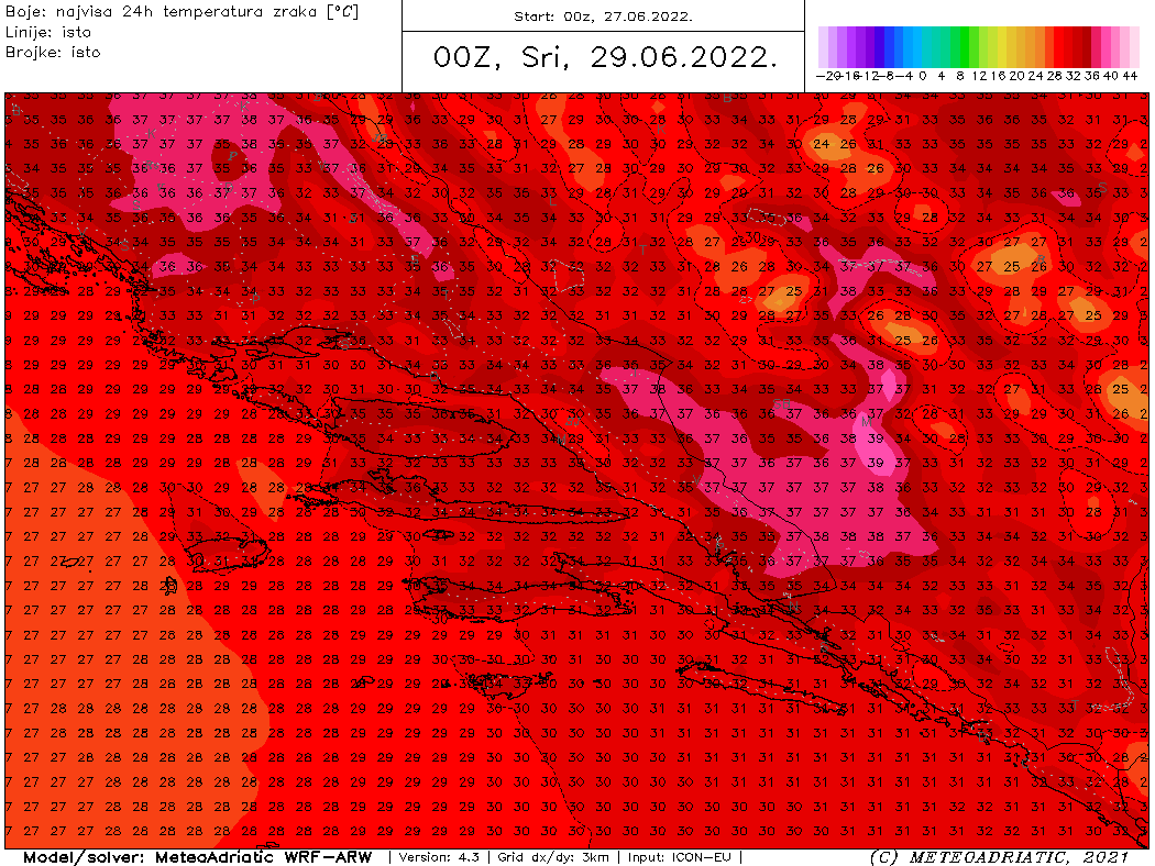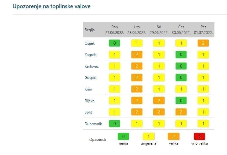 Iako će cijelu tjedan biti vruć ili vrlo vruć, čini se da se utorak i osobito srijeda izdvajaju jer će osobito u srijedu velike vrućine biti povezane s visokom koncentracijom vlage u zraku i jugom koje će prolazno zapuhati.