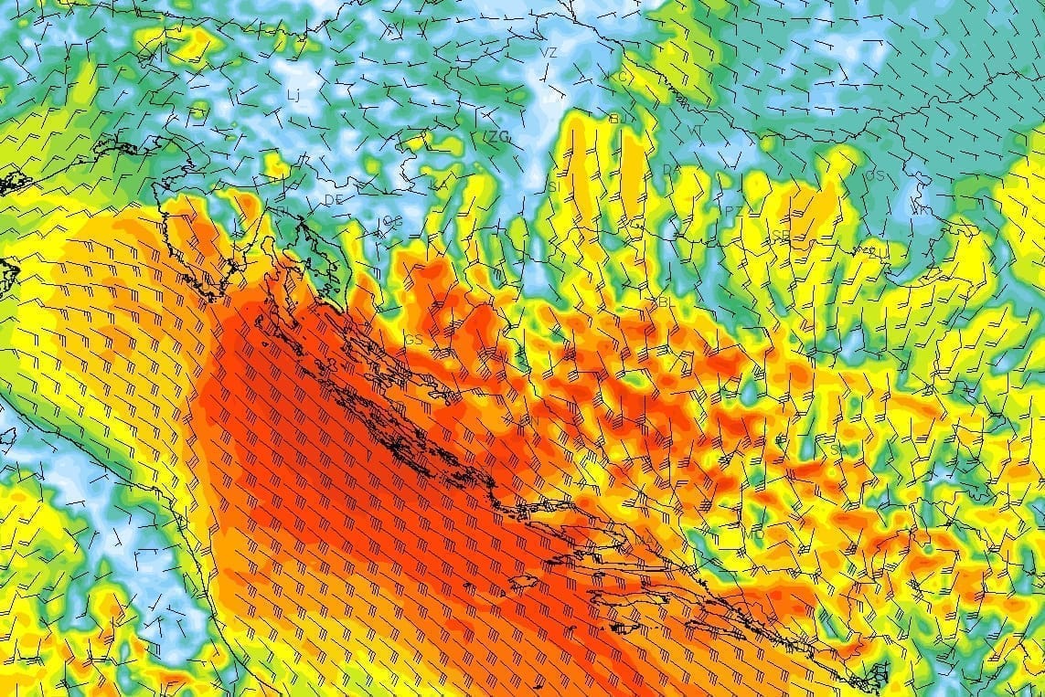 U prvom dijelu ponedjeljka nastavit će se jako do olujno jugo, no u drugom dijelu dana očekuje nas prolazak frontalnog poremećaja koji će, vrlo slično kao u srijedu, biti kratkotrajan, ali intenzivan. Zbog toga će prolazno biti kiše, pljuskova i grmljavine uz umjereno osvježenje i vrlo prolazno okretanje vjetra na tramontanu.